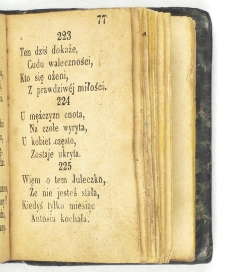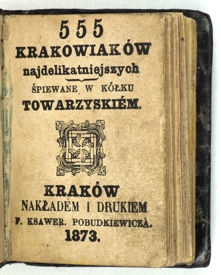 555 KRAKOWIAKÓW najdelikatniejszych. Śpiewane w kółku towarzyskiem. Kraków 1873. Nakł. i drukiem F. Ksawer. Pobudkiewicza. wys. 7,5 cm, s. 187, [5]. opr. ppł. z epoki.