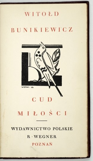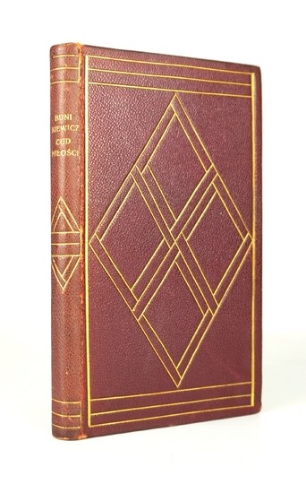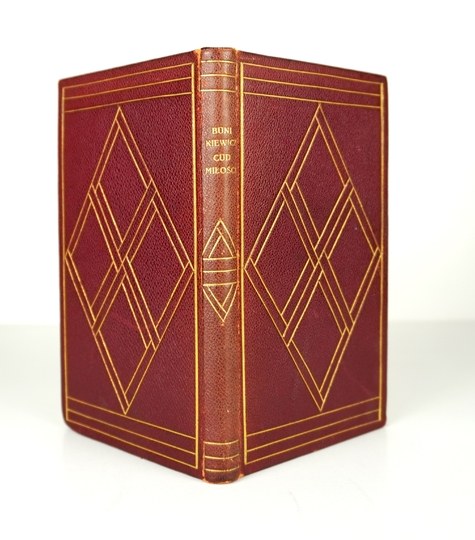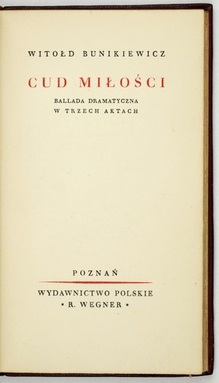 BUNIKIEWICZ Witołd - Cud miłości. Ballada dramatyczna w trzech aktach. Poznań [1928]. Wyd. Polskie R. Wegner. 16d, s. [6], 61, [2]. opr. skóra złoc. z epoki z zach. okł. brosz., obcięcie złoc.