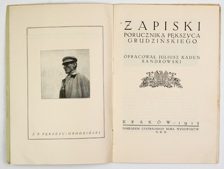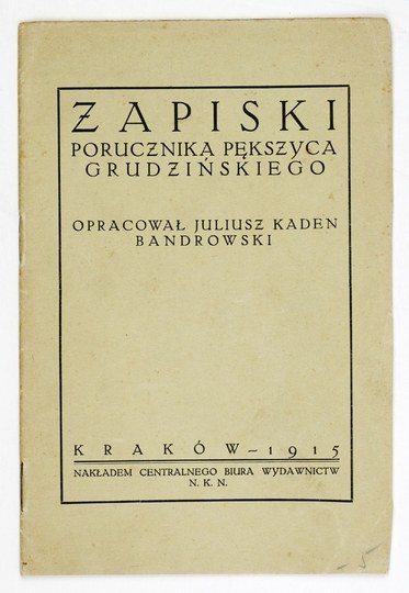 PĘKSZYC-GRUDZIŃSKI [Franciszek] - Zapiski porucznika ... Oprac. Juliusz Kaden Bandrowski. Kraków 1915. Centralne Biuro Wydawnictw NKN. 16d, s. 31. brosz. Odb. z "Ilustr. Tygodnika Polskiego".