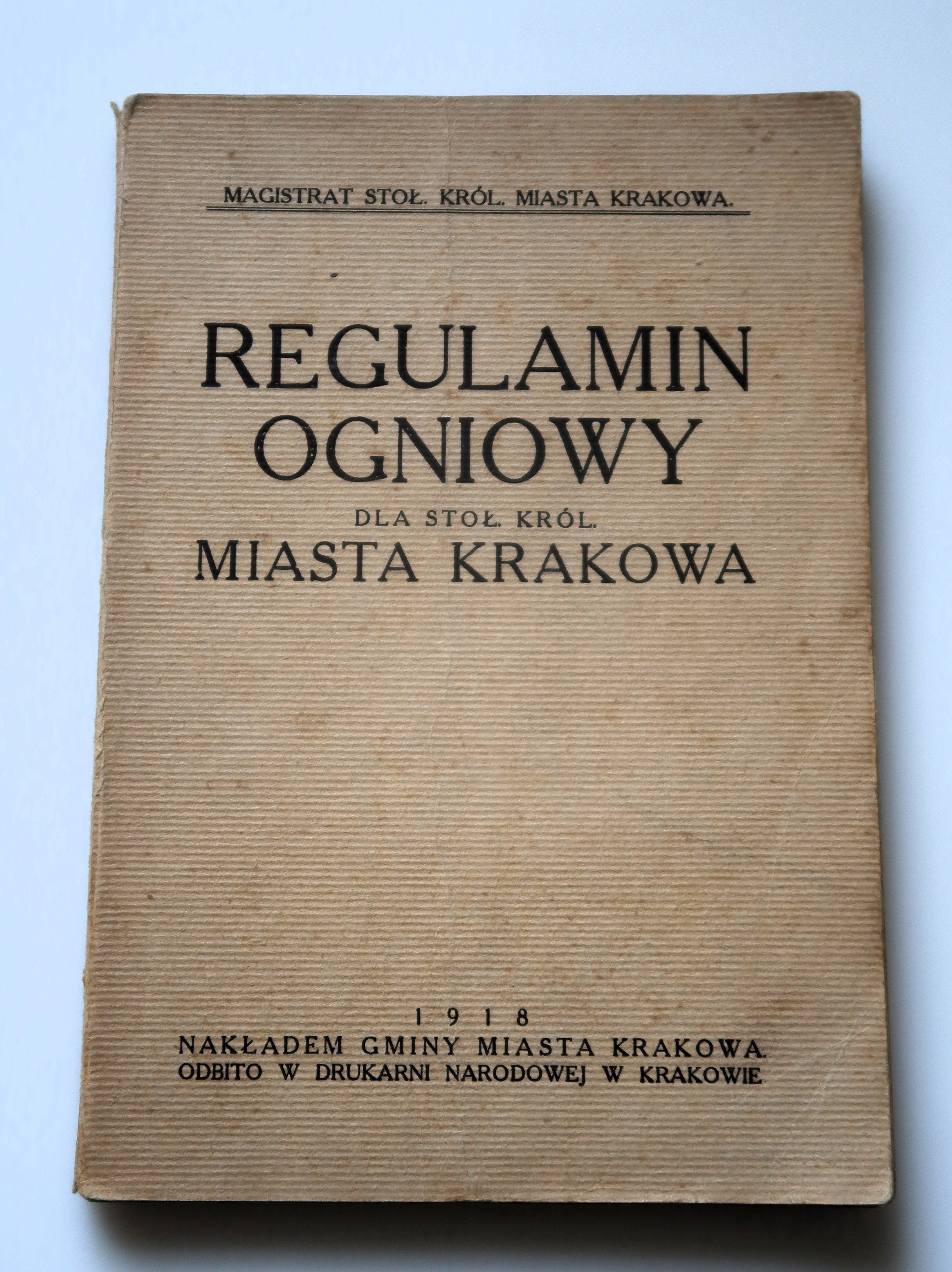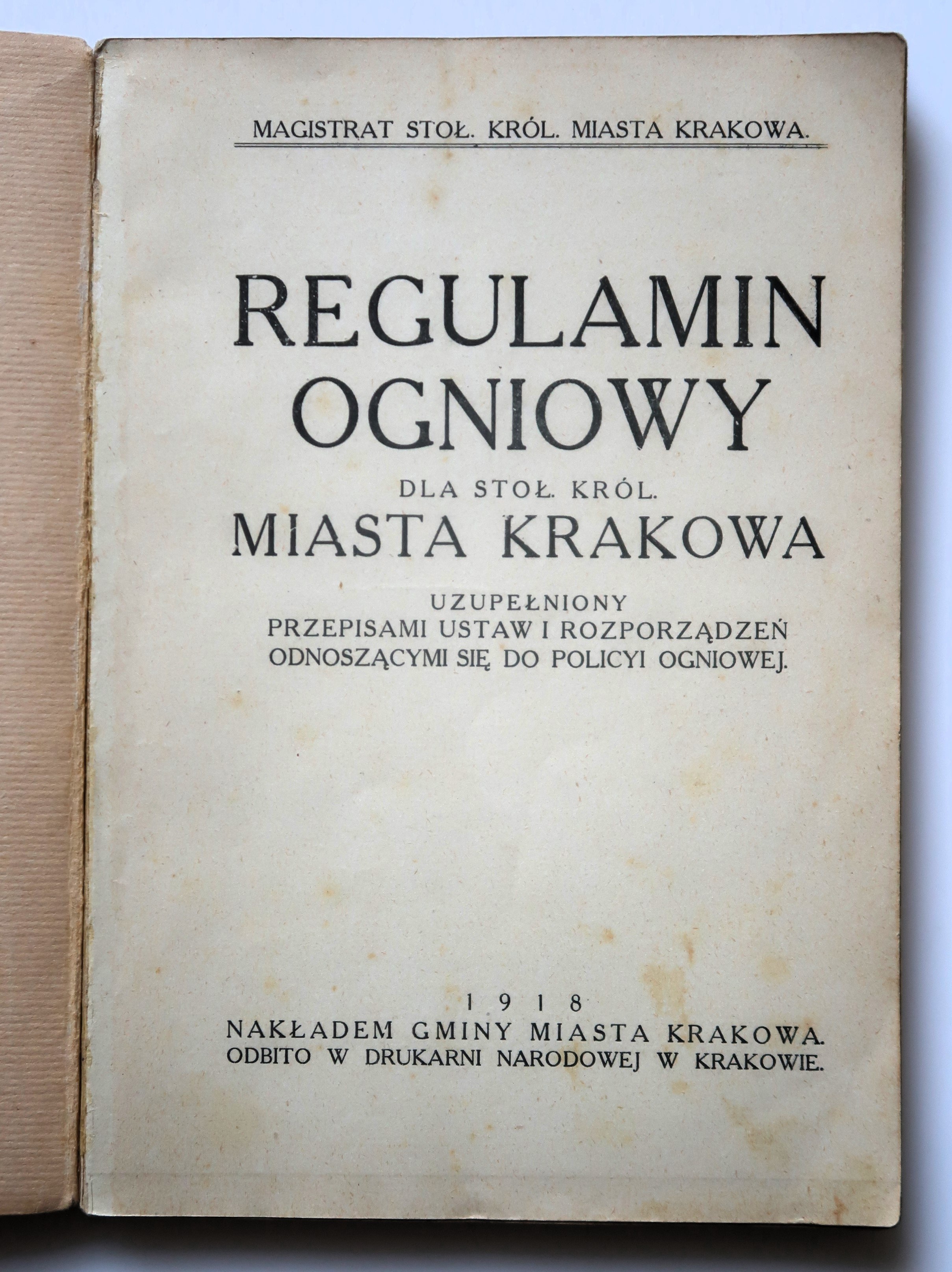 Uzupełniony przepisami ustaw i rozporządzeń odnoszącymi się do policyi ogniowej, nakładem Gminy Miasta Krakowa, odbito w Drukarni Narodowej w Krakowie 1918, Magistrat Stoł Król. Miasta Krakowa, s. 238, wym. 15 x 21,5, oprawa broszurowa, przybrudzenia okładki, nieznaczne przetarcia grzbietu, stan dobry.