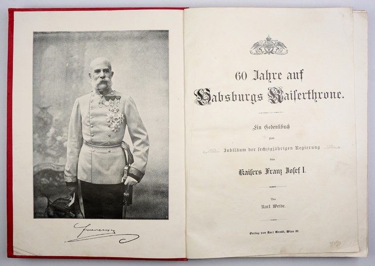WEIDE Karl - 60 Jahre auf Habsburgs Kaiserhrone. Ein Gedenkbuch von ... zum Jubiläum der sechzigjährigen Regierung des Kaiser Franz Josef I. Wien 1908. Verlag von Karl Groak. 4, s. [4], 439, [1]. opr. oryg. pł. zdob.