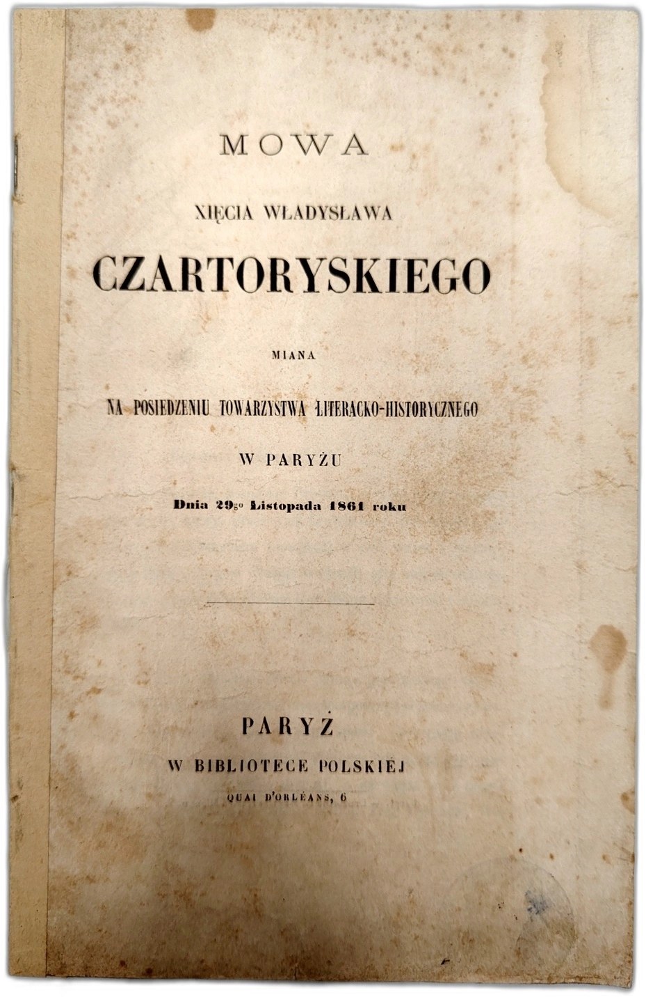 Książe Władysław Czartoryski - mowa miana na posiedzeniu Tow. Literacko Historycznego w Paryżu 29 Listopada 1861,
