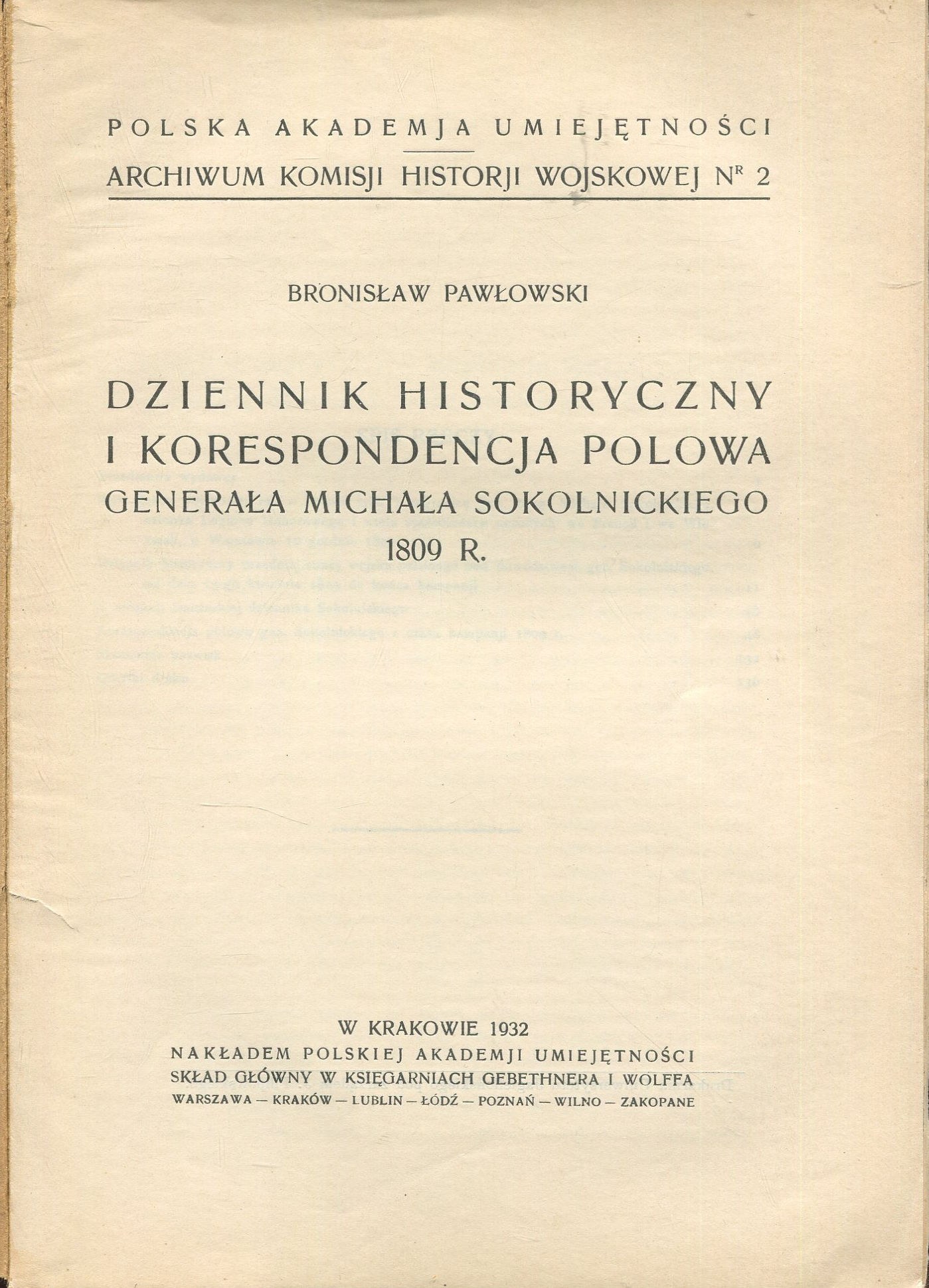 W treści: Stan służby wojskowej tak w Polsce jako i zagranicą gen. bryg. Michała Sokolnickiego, członka Legionu Honorowego i wielu społeczeństw uczonych we Francji i we Włoszech, w Warszawie 10 grudnia 1807. Dziennik historyczny przedniej straży wojska polskiego pod dowództwem gen. Sokolnickiego, od dnia 15-go kwietnia 1809 do końca kampanii. Z redakcji francuskiej dziennika Sokolnickiego. Korespondencja polowa gen. Sokolnickiego z czasu kampanii 1809 r.