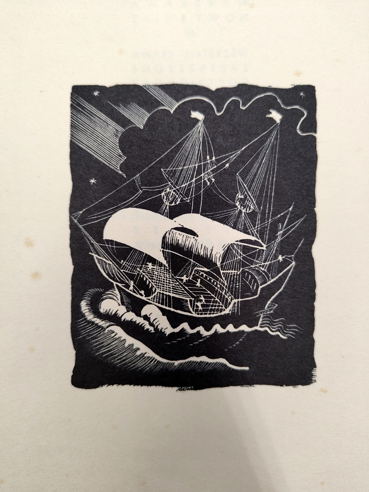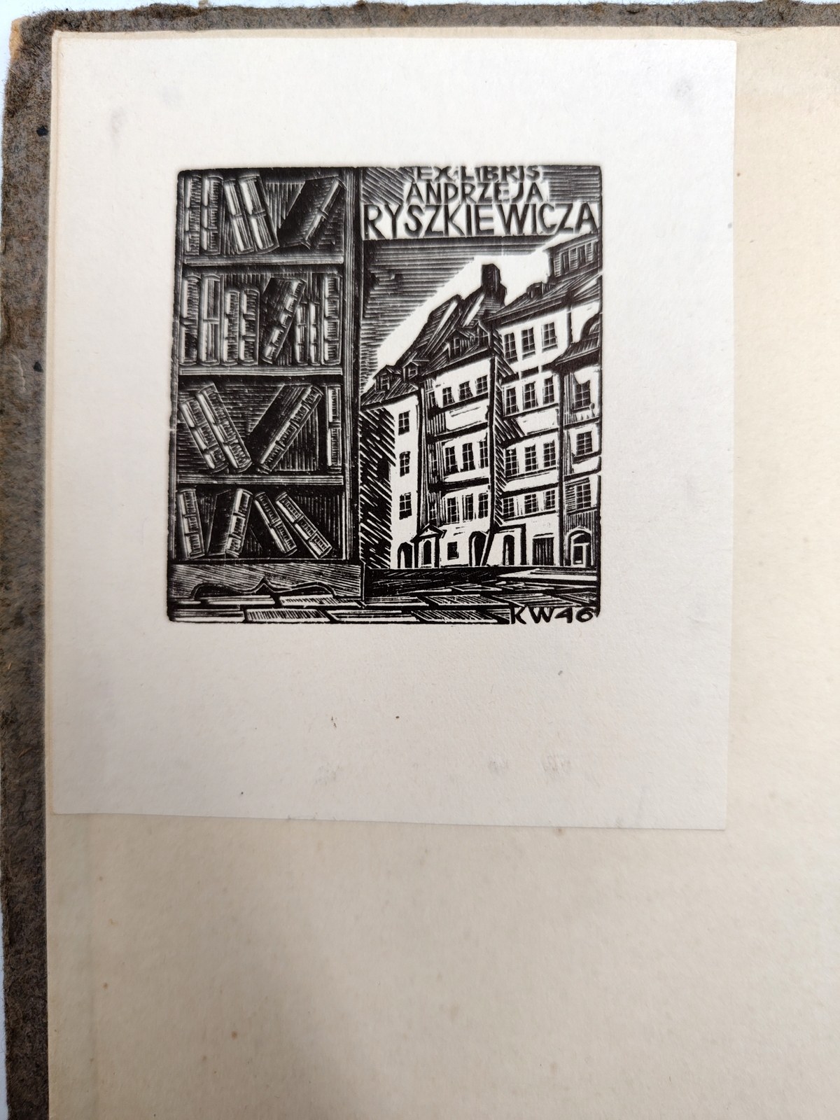 Na przedniej wyklejce Ekslibris Andrzeja Ryszkiewicza* (1922 - 2005) projektu K. Wiszniewskiego z 1946 roku.
