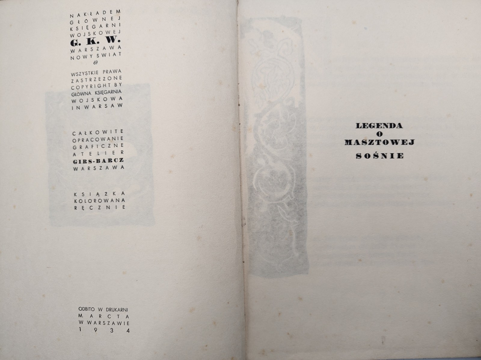 Stępowski Janusz - Legenda o masztowej sośnie - Warszawa 1934 [ Ekslibris Andrzej Ryszkiewicz, opracowanie graf. Atelier Girs - Barcz, książka kolorowana ręcznie ]