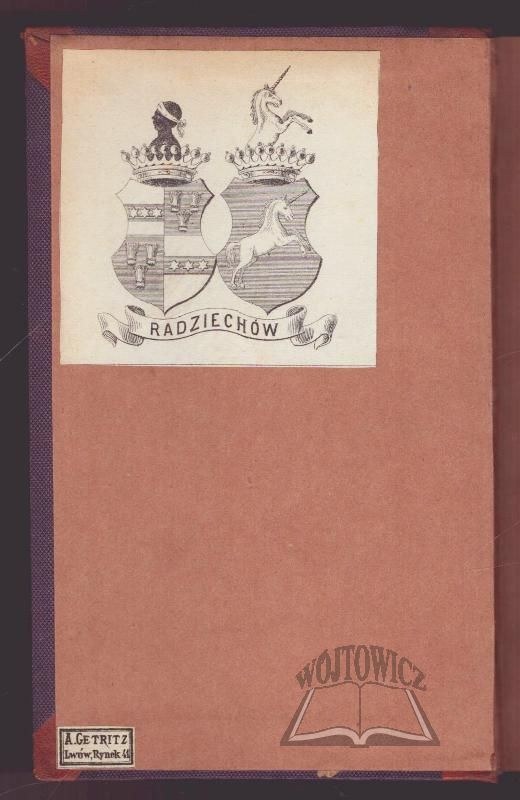 Na wyklejce exlibris herbowy Mier i Bończa oraz nadruk Radziechów. Pieczęcie herbowe "Biblioteka Radziechowska". Na okładce nalepka biblioteczna - "Bibljoteka Radziechowska". Oprawa introlig. sygn. "A.Getritz, Lwów, Rynek 41". Niew. otarcie i zabrudz. opr., zaplam. kart. Na k. tyt. podpis własn. Stan dobry. Zawiera: Część 1 - Południowe i środkowe Niemcy; Część 2 - Berlin i Berlińczycy.