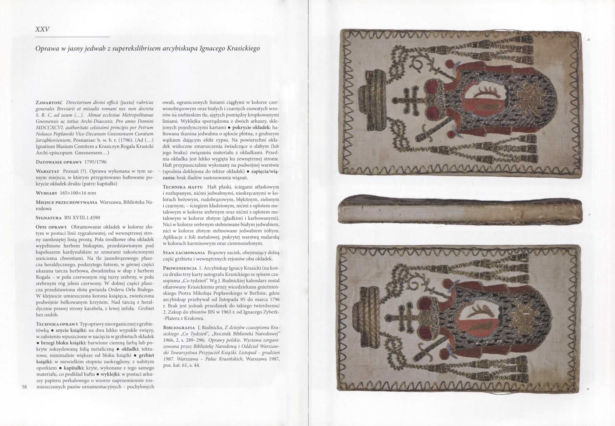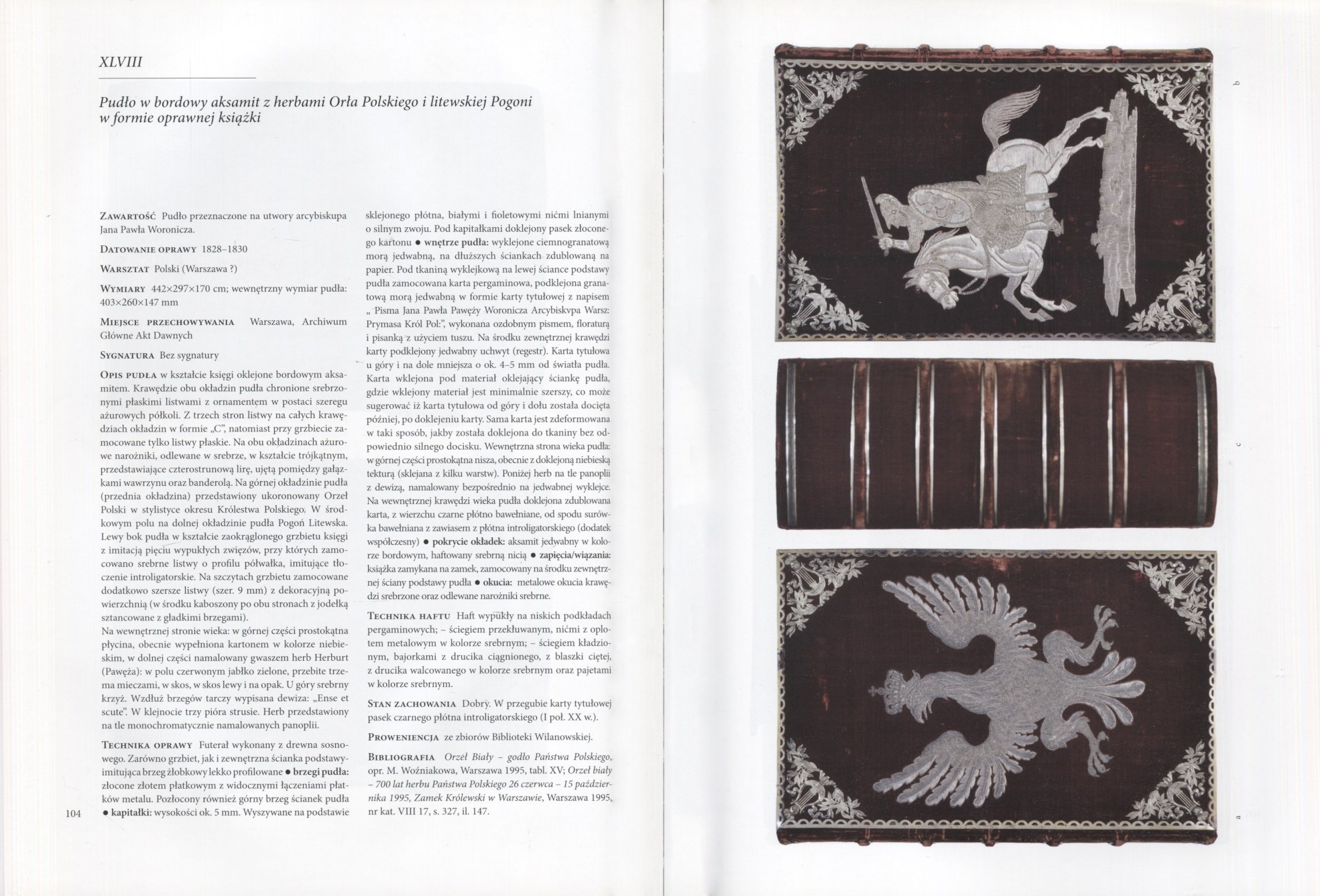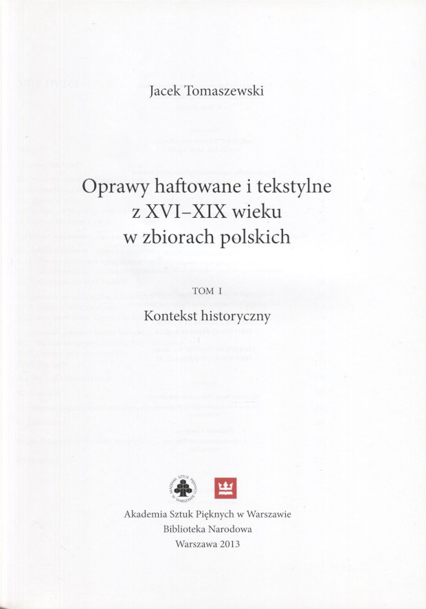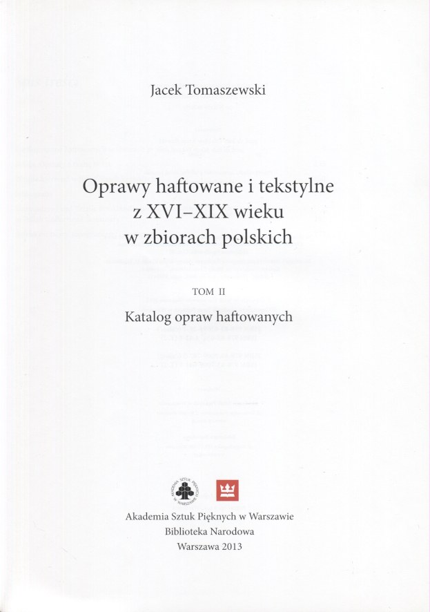 TOMASZEWSKI, Jacek - Oprawy haftowane i tekstylne z XVI-XIX wieku w zbiorach polskich. T. 1, Kontekst historyczny. T. 2, Katalog opraw haftowanych. Warszawa 2013, Akademia Sztuk Pięknych, Biblioteka Narodowa. 29 cm, s. 241, [1], ilustr. kolor.; s. 284, [1], ilustr. kolor.