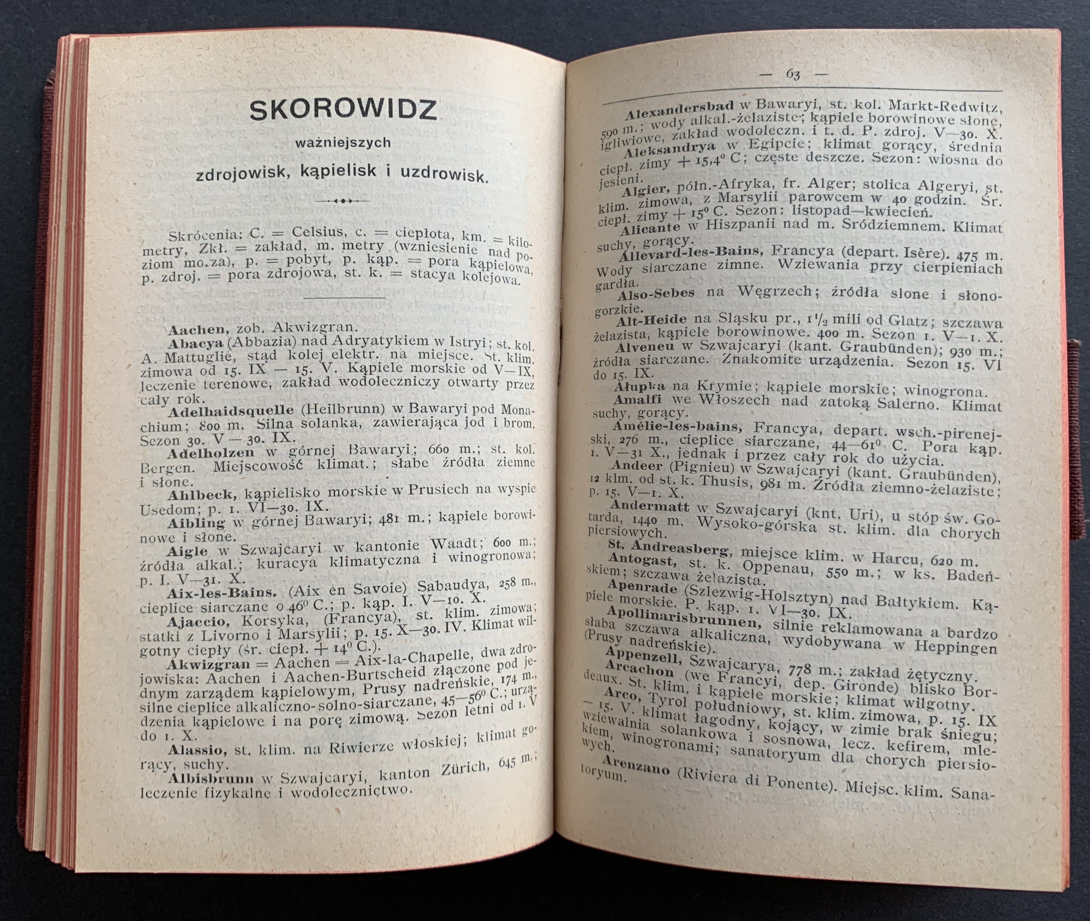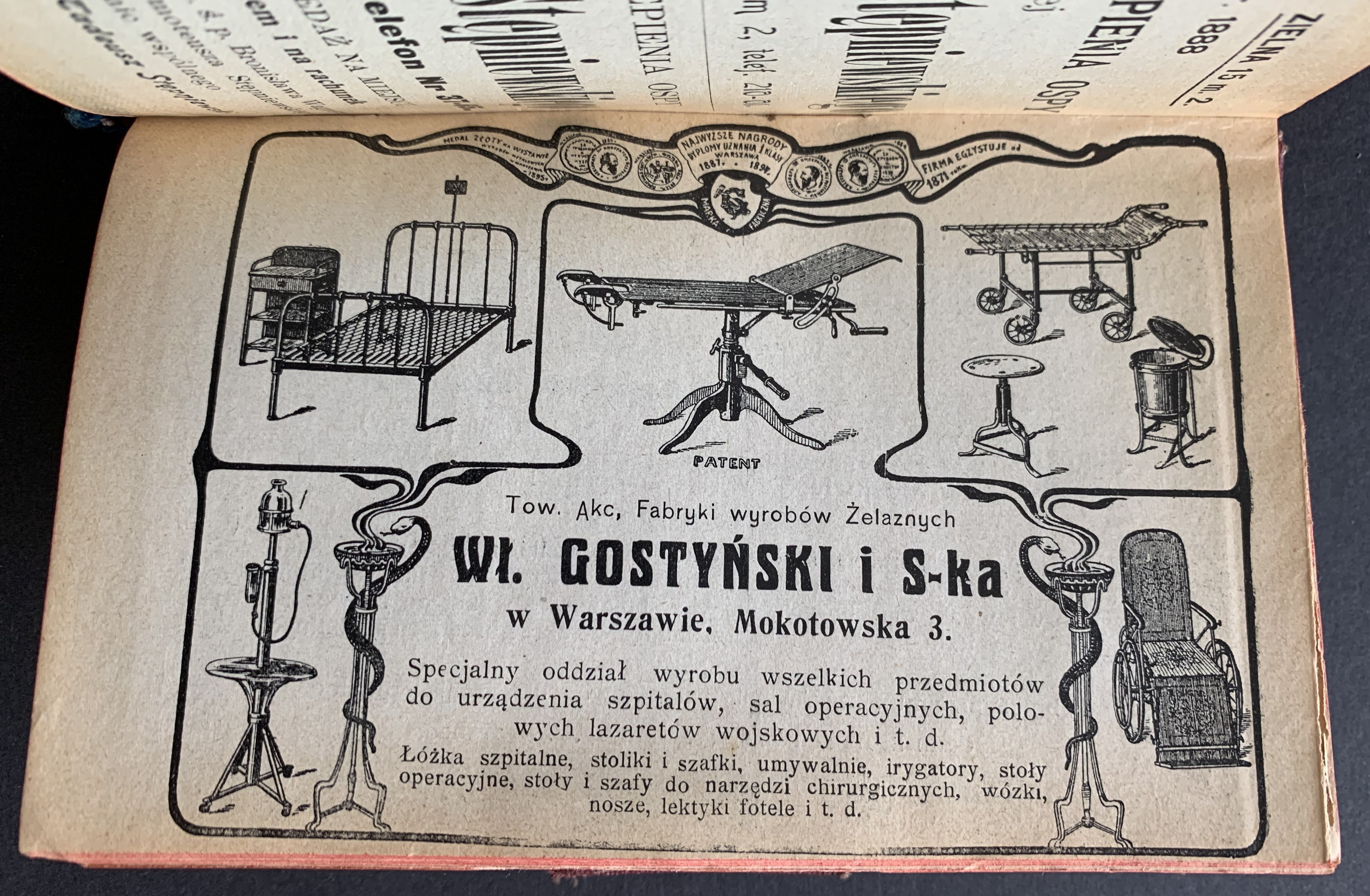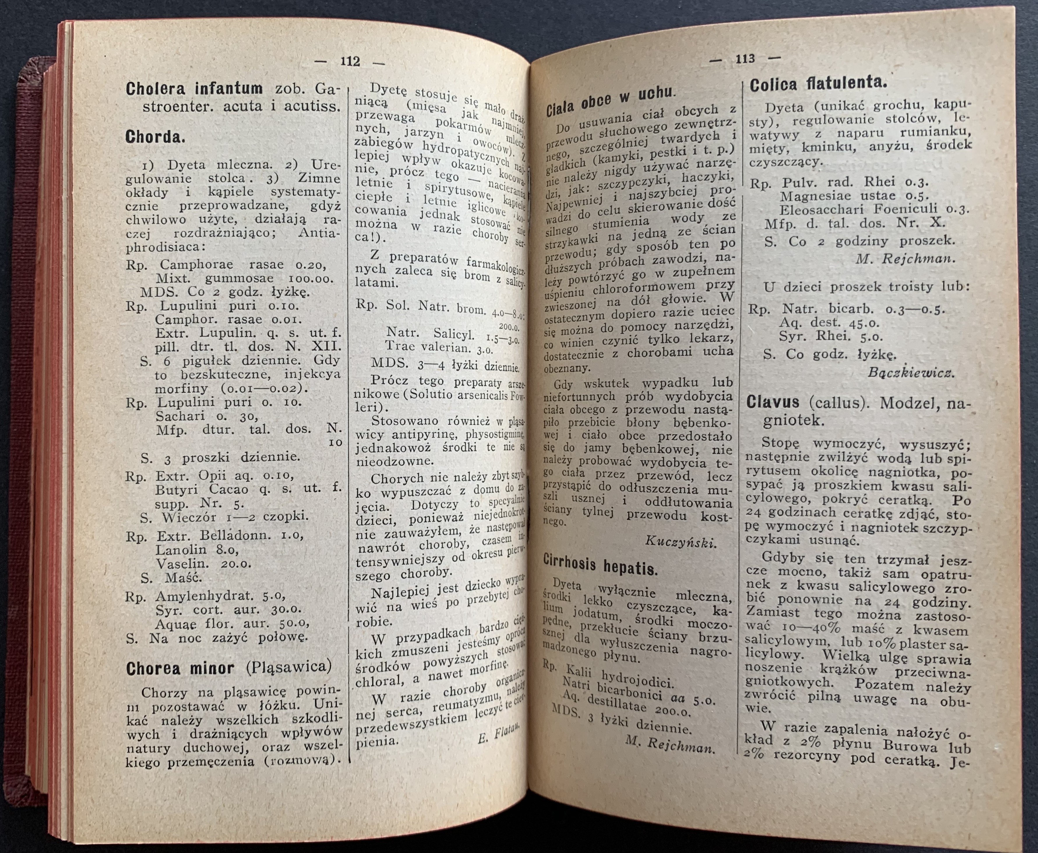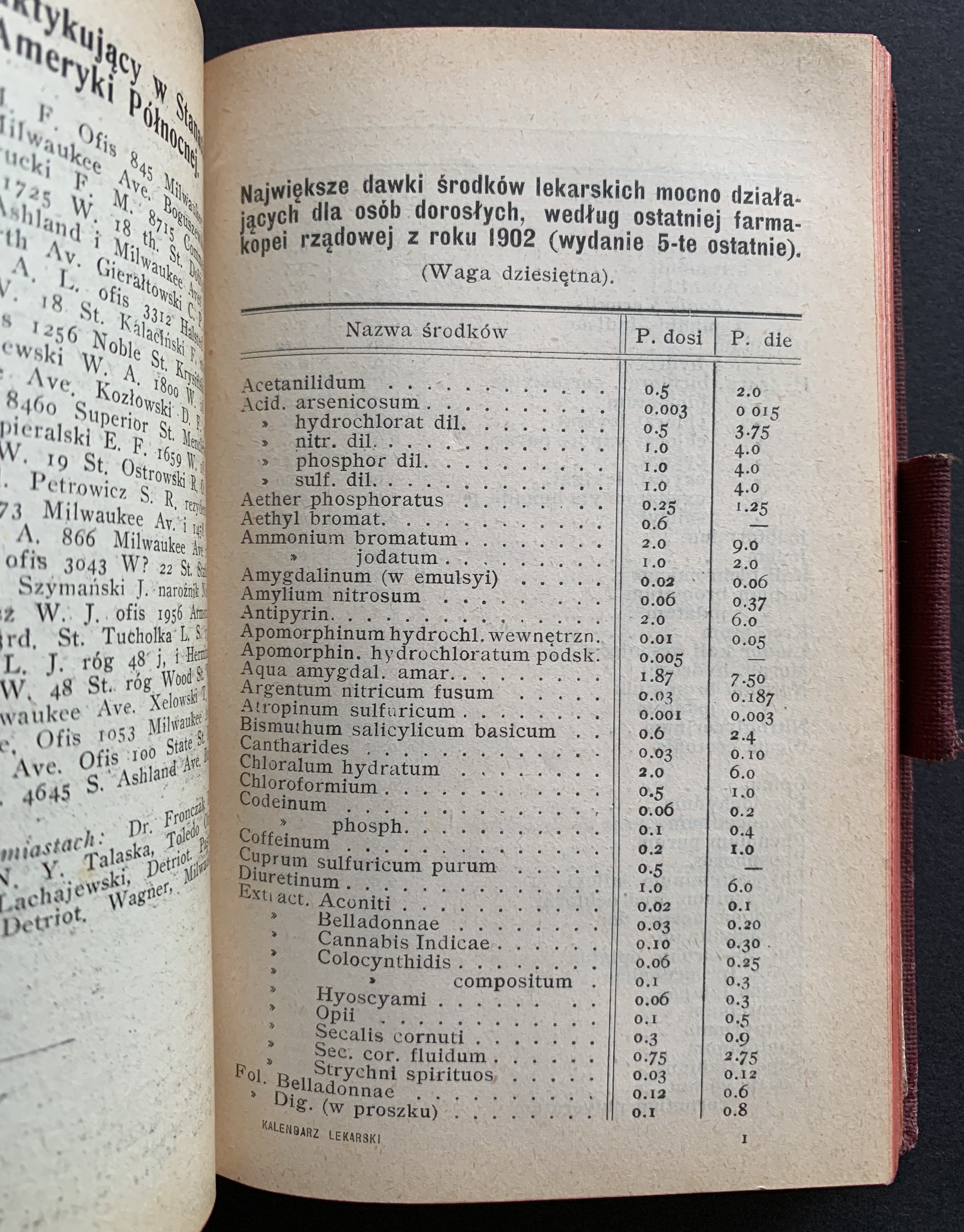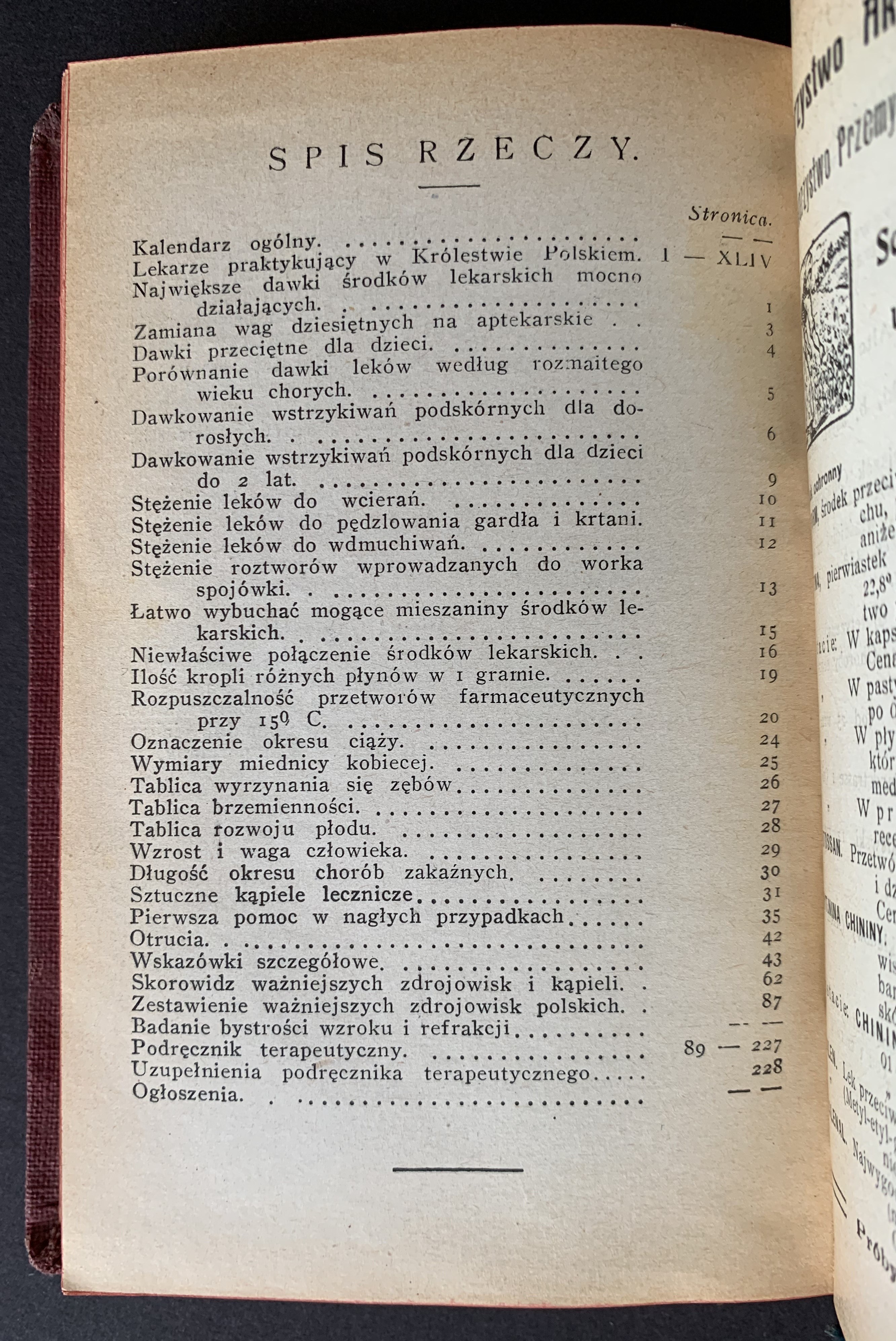 Zawiera m.in.: Kalendarz ogólny; Lekarze praktykujący w Królestwie Polskiem; Największe dawki środków lekarskich działających mocno; Zamiana wag dziesiętnych na aptekarskie; Dawki przeciętne dla dzieci; Porównanie dawki leków według rozmaitego wieku chorych; Dawkowanie wstrzykiwań podskórnych dla dorosłych; Dawkowanie wstrzykiwań podskórnych dla dzieci do 2 lat; Stężenie leków do wcierań; Stężenie leków do pędzlowania gardła i krtani; Stężenie leków do wdmuchiwań; Stężenie roztworów wprowadzanych do worka spojówki; Łatwo wybuchać mogące mieszaniny; środków lekarskich; Niewłaściwe połączenie środków lekarskich; Ilość kropli różnych płynów w I gramie; Rozpuszczalność przetworów farmaceutycznych przy 159 C; Oznaczenie okresu ciąży; Wymiary miednicy kobiecej; Tablica wyrzynania się zębów; Tablica brzemienności; Tablica rozwoju płodu; Wzrost i waga człowieka; Długość okresu chorób zakaźnych; Sztuczne kąpiele lecznicze; Pierwsza pomoc w nagłych przypadkach, Otrucia; Wskazówki szczegółowe; Skorowidz ważniejszych zdrojowisk i kąpieli; Zestawienie ważniejszych zdrojowisk polskich; Badanie bystrości wzroku i refrakcji.