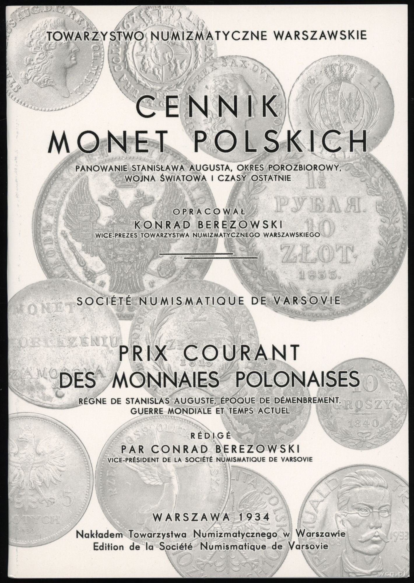 Berezowski Konrad – Cennik monet polskich. Panowanie Stanisława Augusta, okres porozbiorowy, wojna światowa i czasy ostatnie opracował Konrad Berezowski, wice-prezes Towarzystwa Numizmatycznego Warszawskiego, Warszawa 1934 (REPRINT)