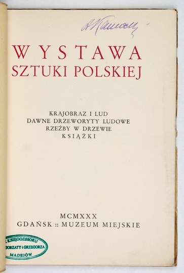 [Towarzystwo Szerzenia Sztuki Polskiej wśród Obcych]. Muzeum Miejskie, Gdańsk. Wystawa sztuki polskiej. Krajobraz i lud, Dawne drzeworyty ludowe, Rzeźby w drzewie, Książki. Gdańsk 1930. 8, s. 31, tabl. 24. brosz.