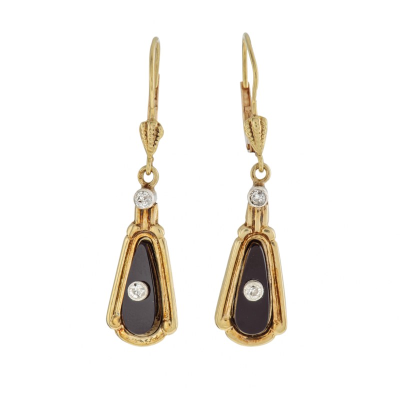 złoto pr. ~ 0,500, 4 szt. diamentów ł. ~ 0,13 ct H-J/Si-P1, 2 szt. onyksów, masa: 2,40 g; wym.: 3,8 x 0,9 cm