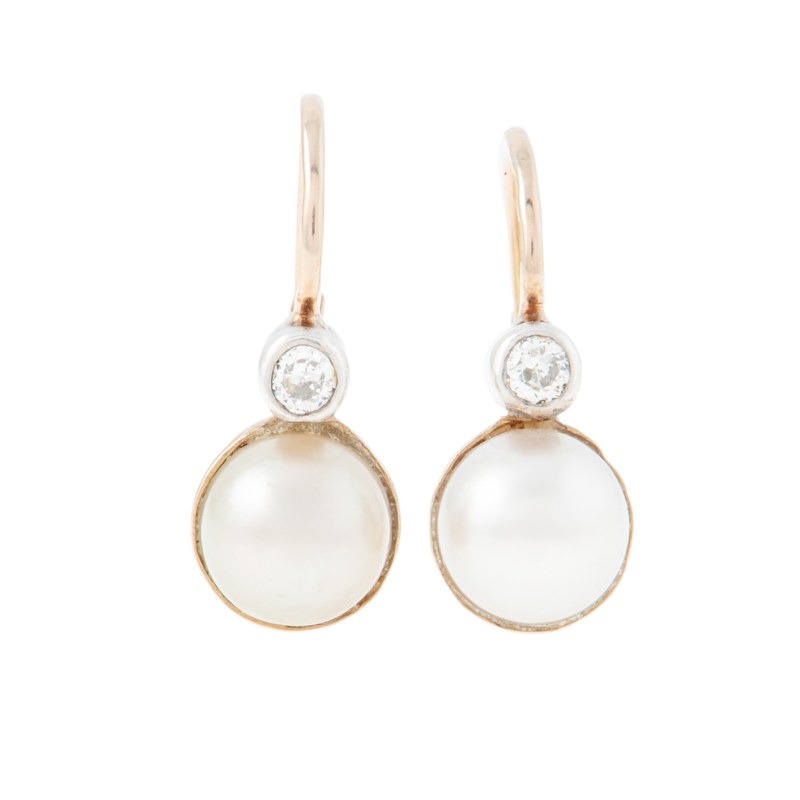 złoto pr. ~ 0,585, srebro, 2 szt. pereł hodowanych akoya, 2 szt. diamentów ł. ~ 0,11 ct J/Si-P1, masa: 2,84 g; wym.: 1,9 x 0,7 cm; sygn.: "BAV"