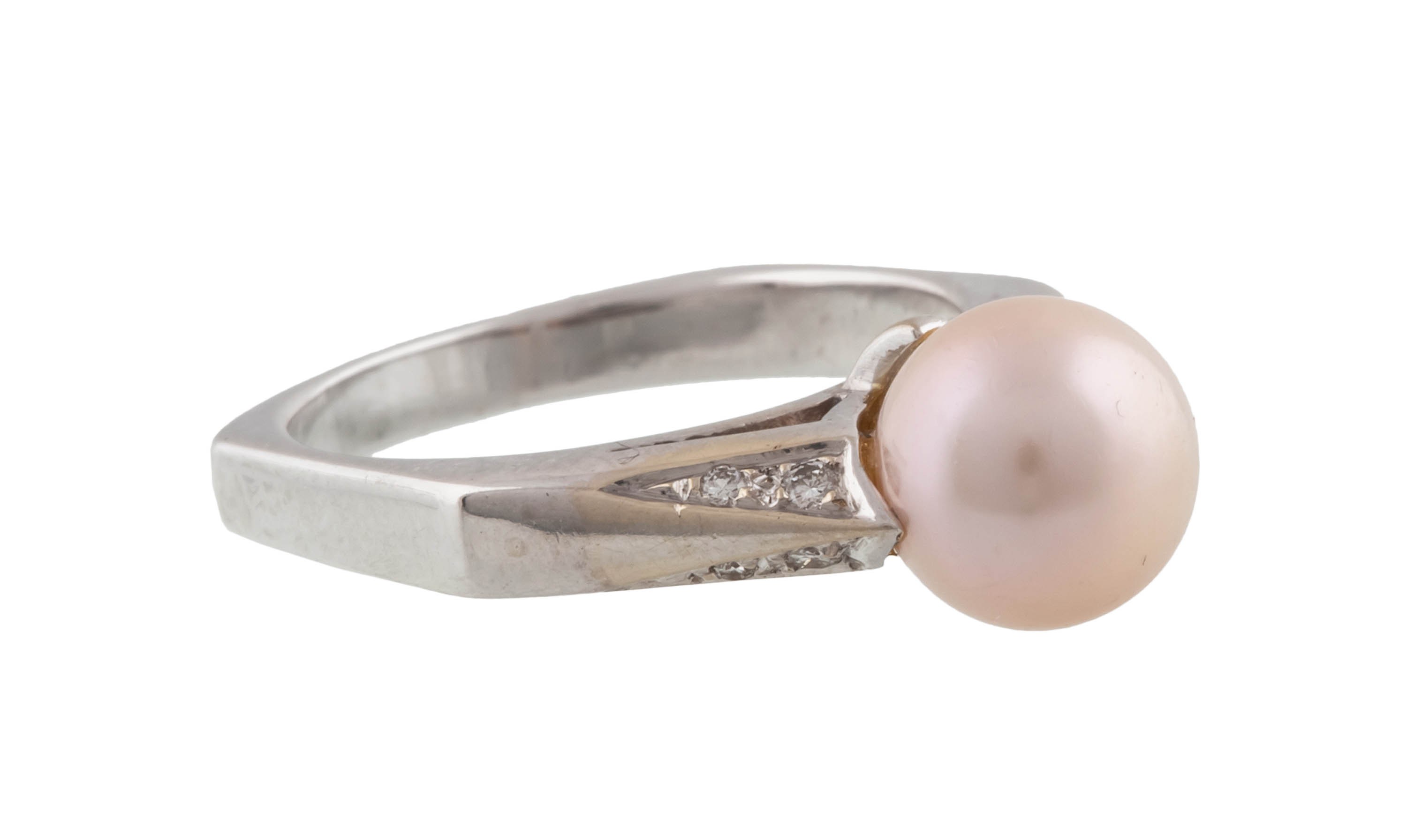 złoto, pr. ok. 0,750, m. 5,3 g, 8 szt. brylantów łącznie ok. 0,06 ct, G-H/VS-SI, perła hodowana śr. ok. 8,29 mm, rozmiar 14
