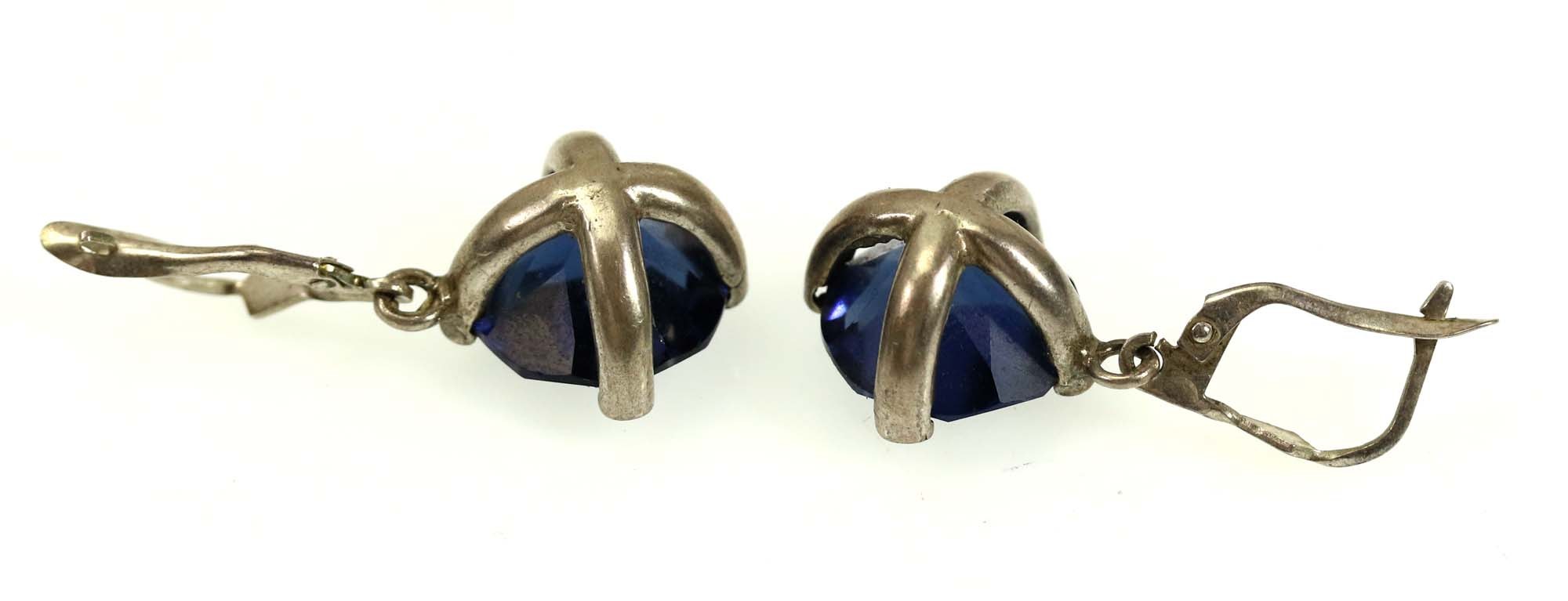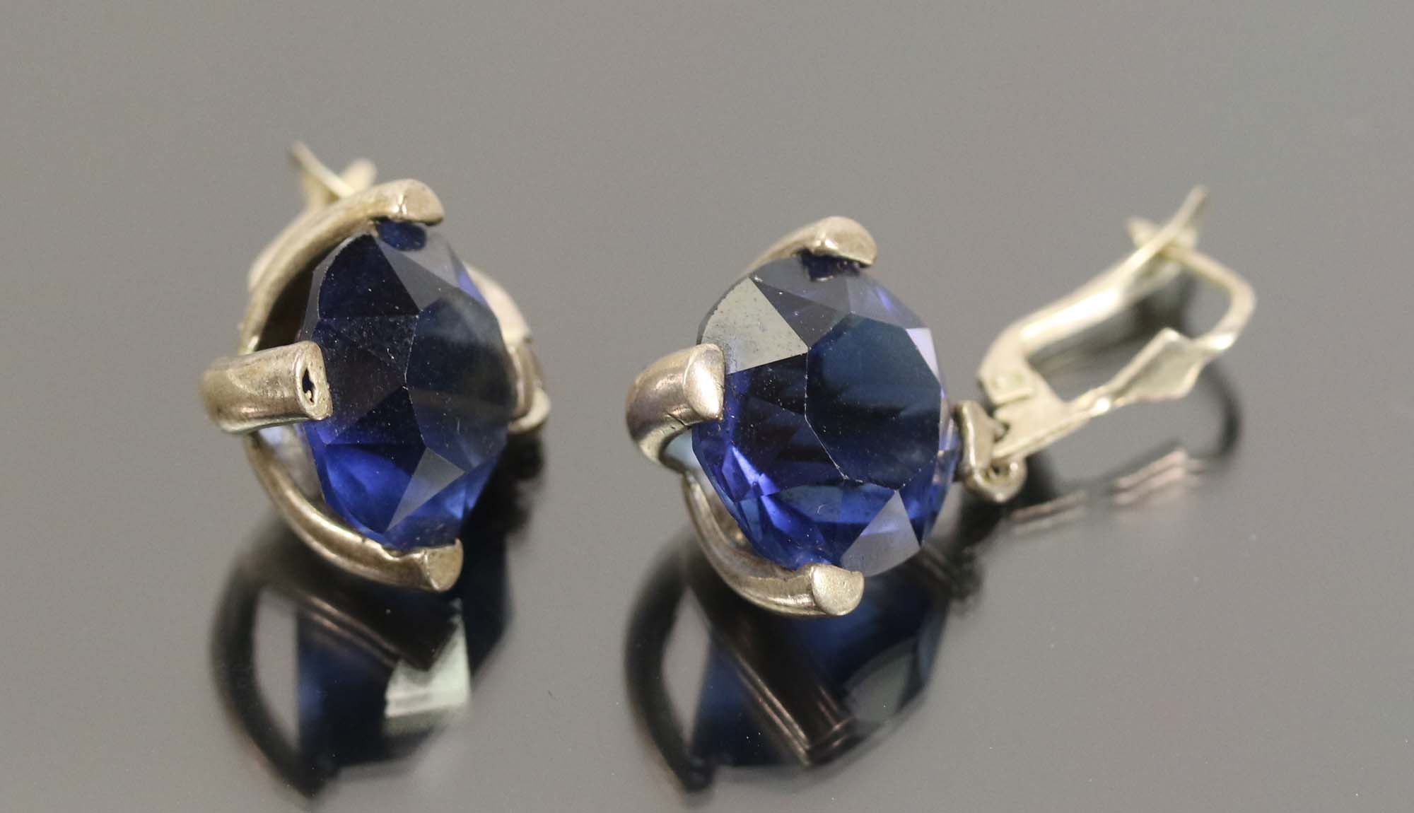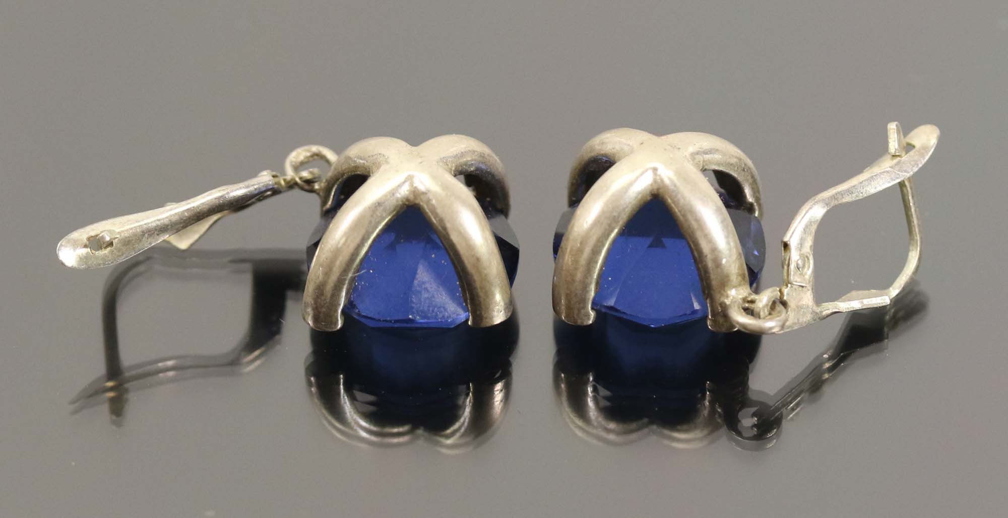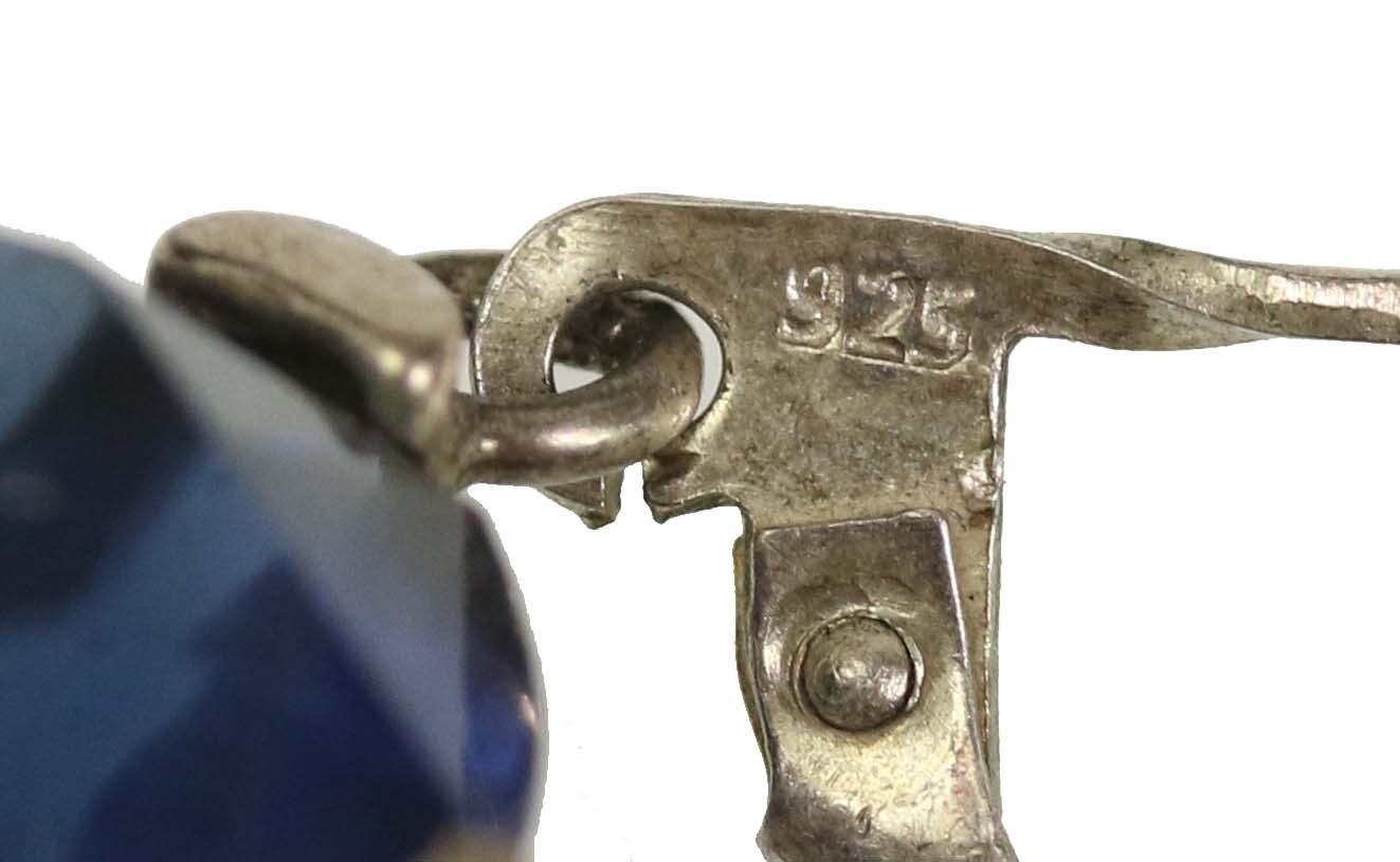 Kolczyki z niebieską cyrkonią. Srebro próby 925, brak znaku wytwórcy. Łączna waga kolczyków 8,04g. Wym. kamienia 15 x 15mm.