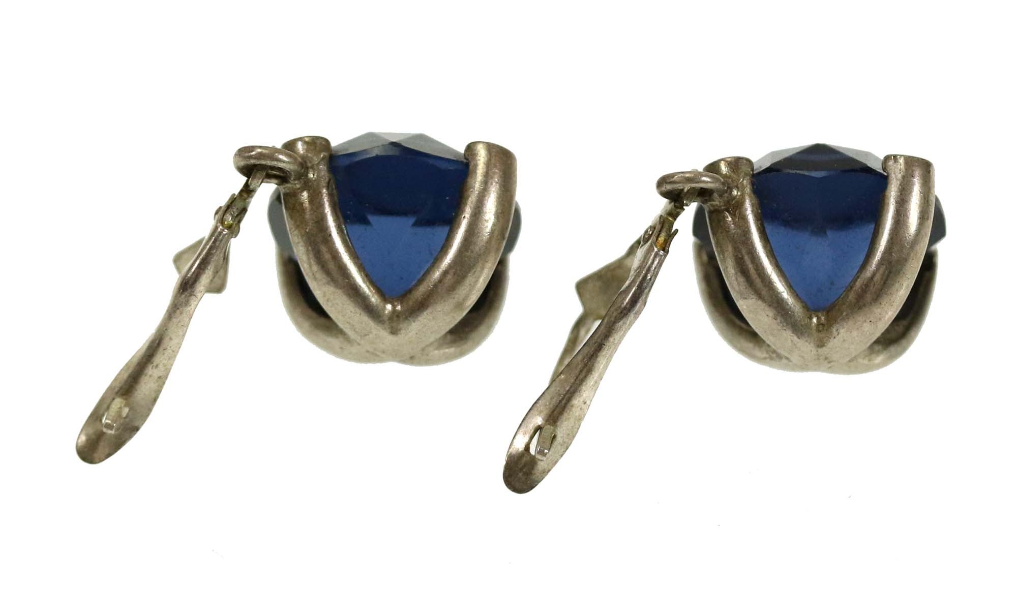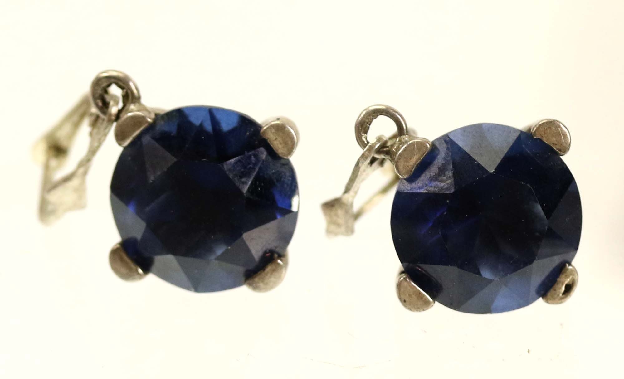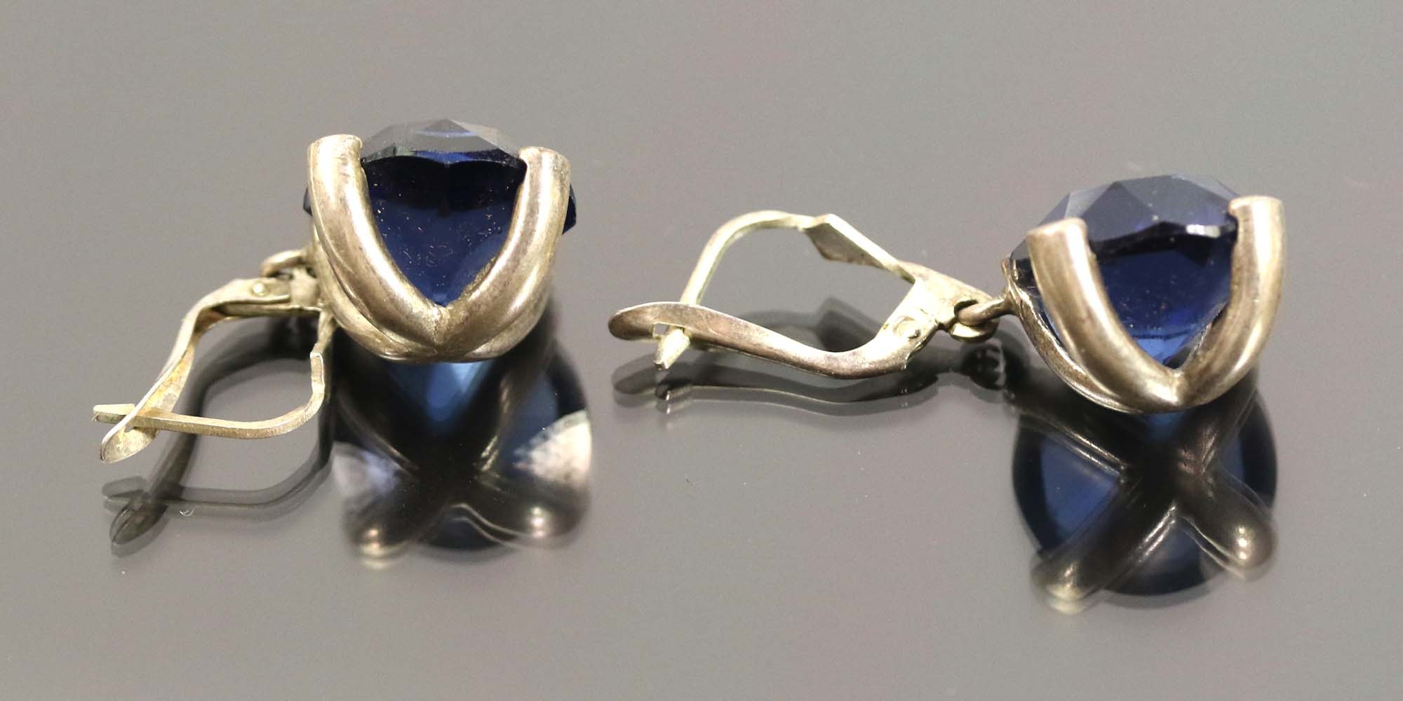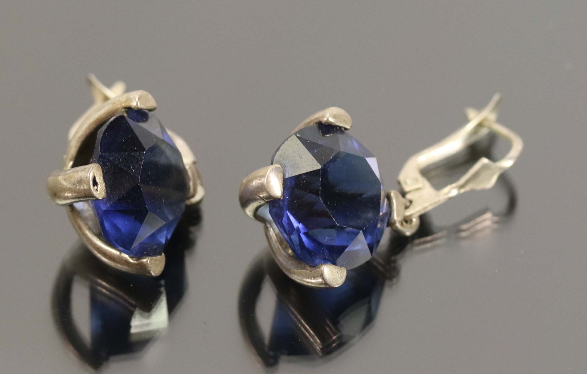 Kolczyki z niebieską cyrkonią. Srebro próby 925, brak znaku wytwórcy. Łączna waga kolczyków 8,04g. Wym. kamienia 15 x 15mm.