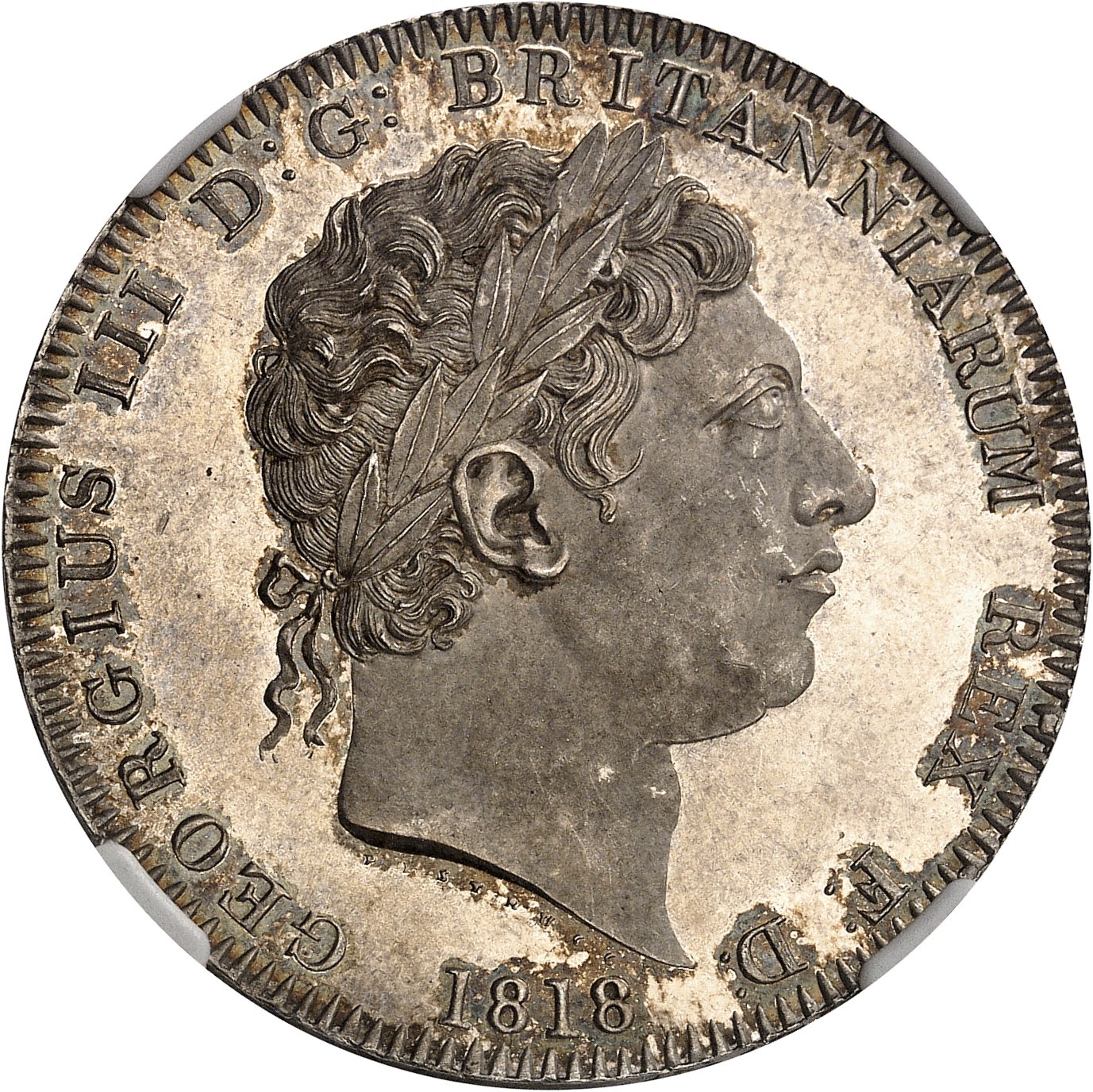 Av. GEORGIUS III D: G: BRITANNIARUM REX F: D:. Tête couronnée à droite, signature PISTRUCCI et (date).