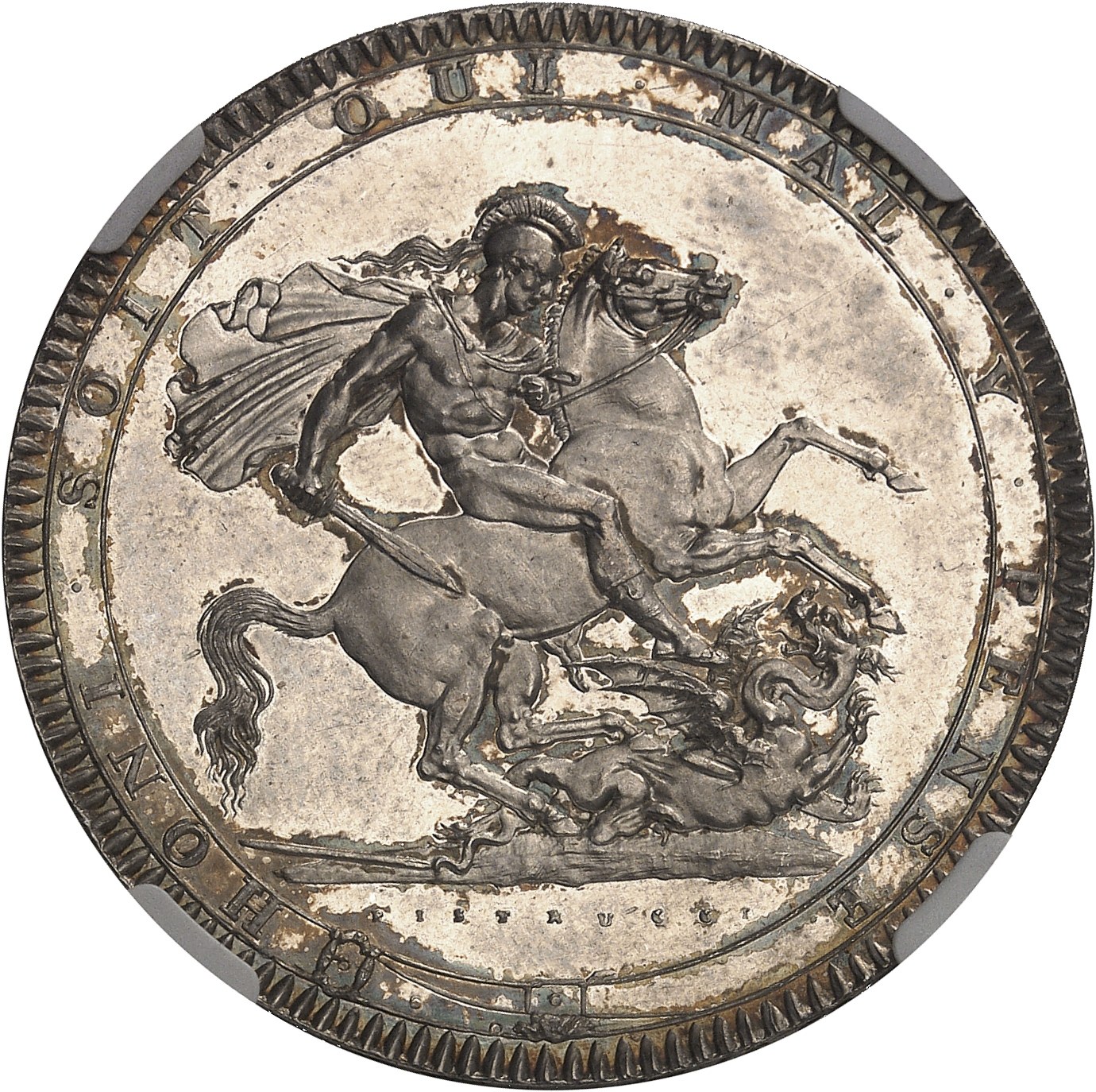 Rv. HONI. SOIT. QUI. MAL. Y. PENSE. Saint Georges terrassant le dragon, signature PISTRUCCI.