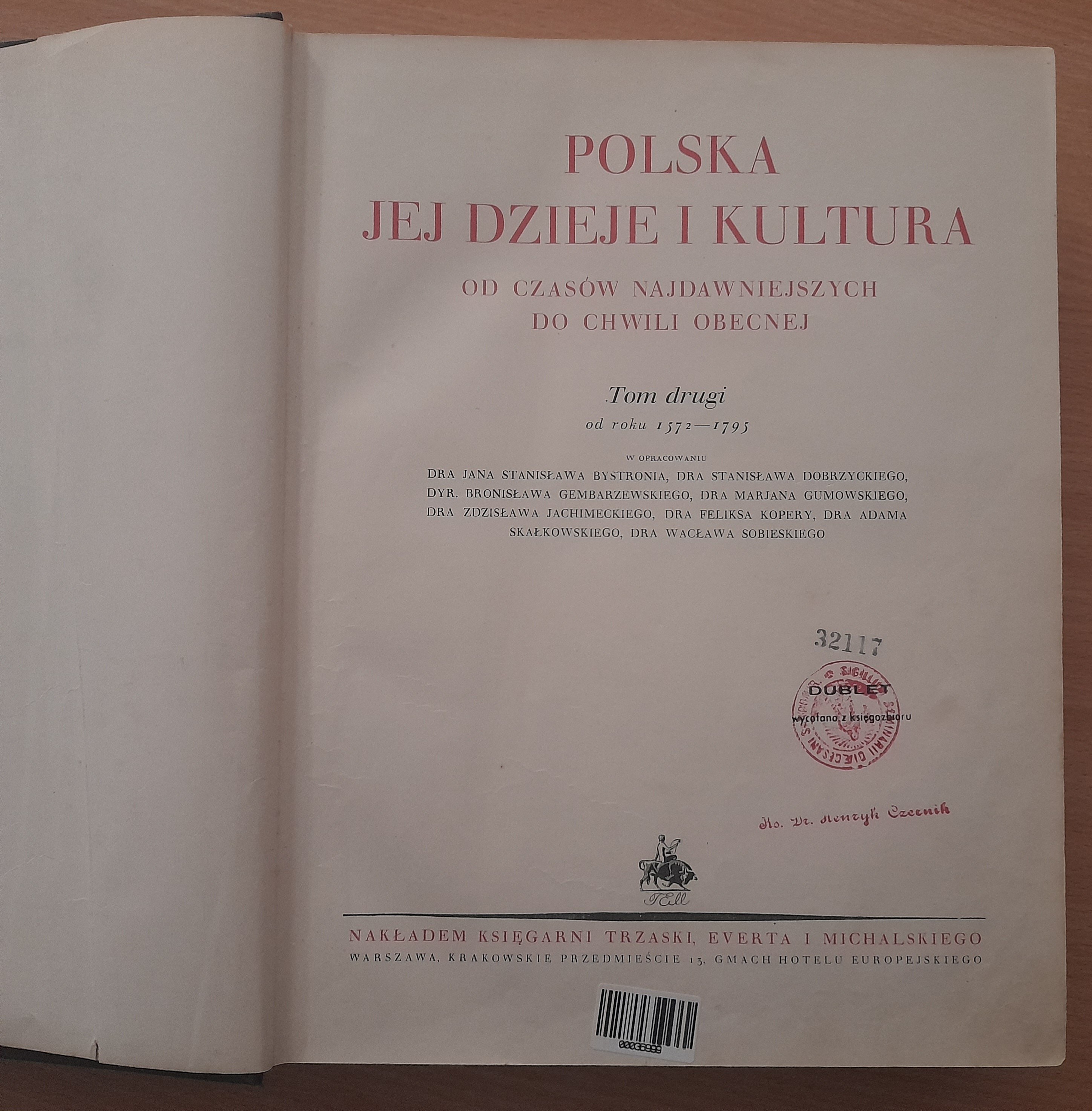 Polska jej dzieje i kultura Od czasów najdawniejszych do chwili obecnej. Tom 2 Od roku 1572-1795, Warszawa [1927] Nakł. Trzaska, Evert i Michalski, str. 598, ilustr. + tablice, opr. oryg. pł. 33cm /granatowa oprawa wydawnicza, nieakt. pieczęć własności./