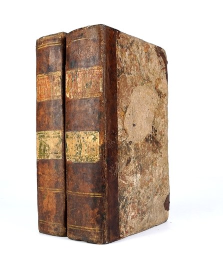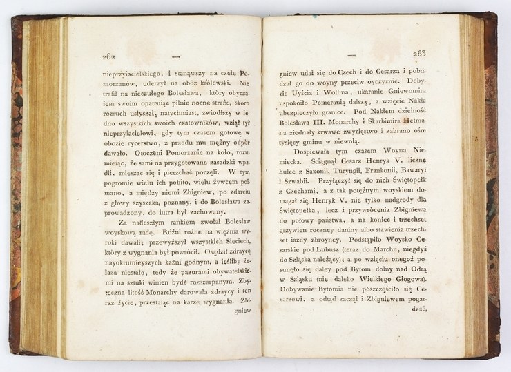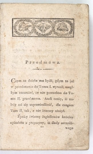 E.1, 62. Brak karty tyt. w t. 2, brak tablic. Opr. otarte, bloki lekko nadpęknięte w grzbiecie, miejscowe zaplamienia, ślad zawilgocenia. Podpisy własn. na przedniej wyklejce t. 2. Z przedmowy: "Dzieło całe z sześciudziesiąt arkuszy złożone zawiera krótkie wyobrażenie dziejów królestwa Polskiego od początku aż do ostatniego rozbioru Państwa przeszło ośmiosetletniego, które jedno z naypierwszych było w Europie".
