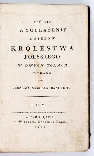 BANDTKIE Jerzy Samuel - Krótkie wyobrażenie dzieiów Królestwa Polskiego w dwuch [!] tomach wydane przez ... T. 1-2. Wrocław 1810. W. B. Korn. 16d, s. VIII, 444; [III]-X, 664. opr. psk. z epoki.