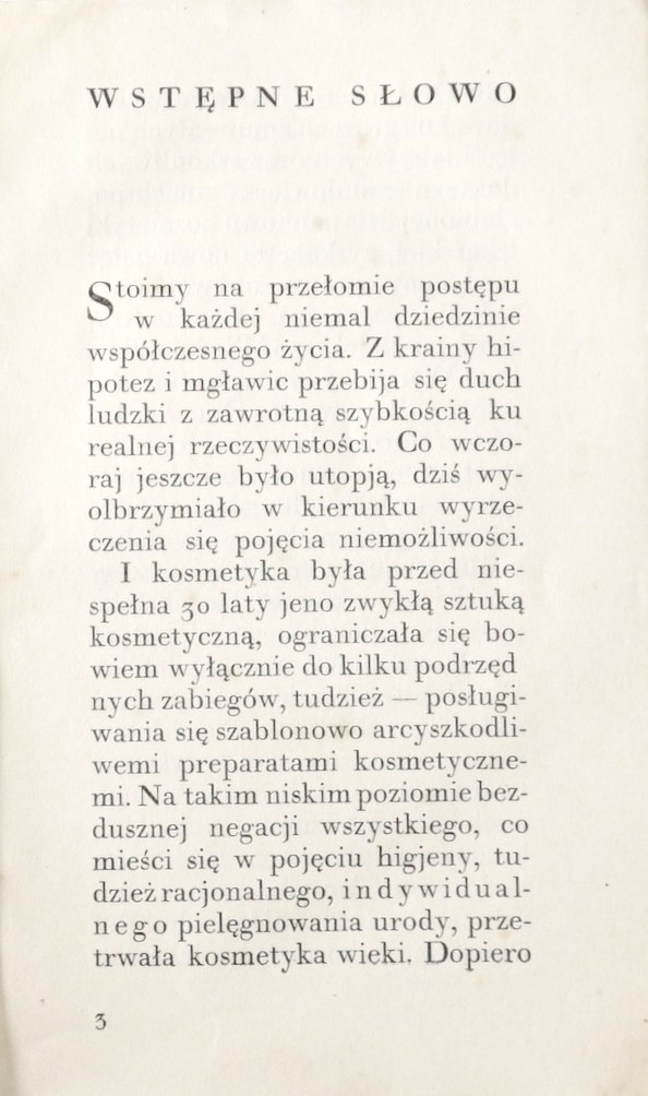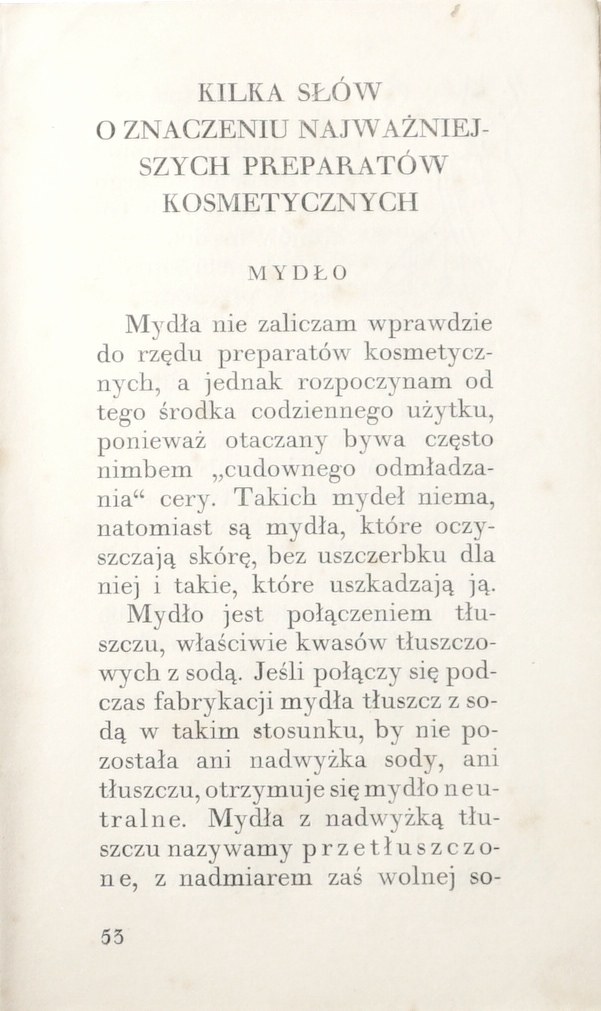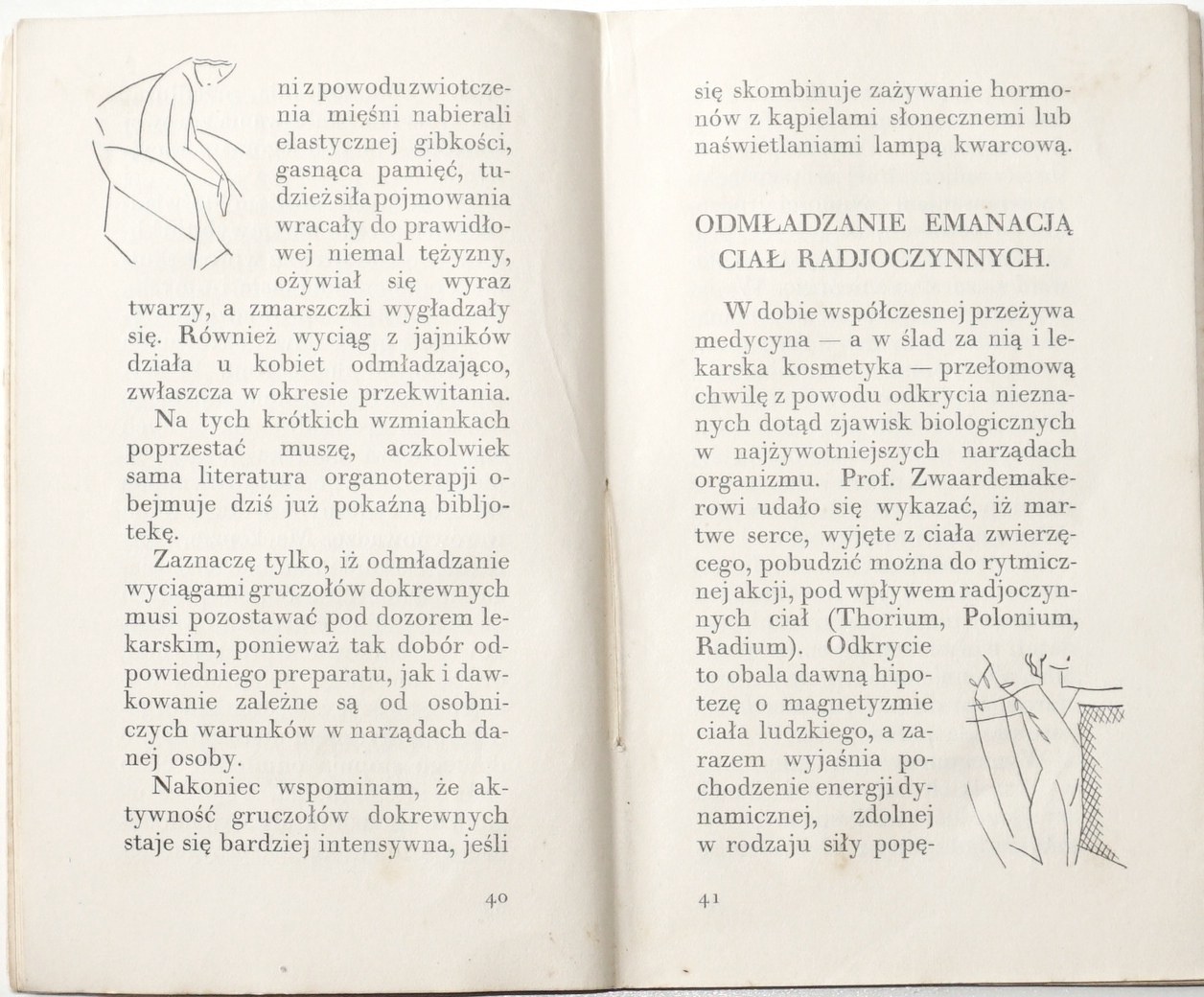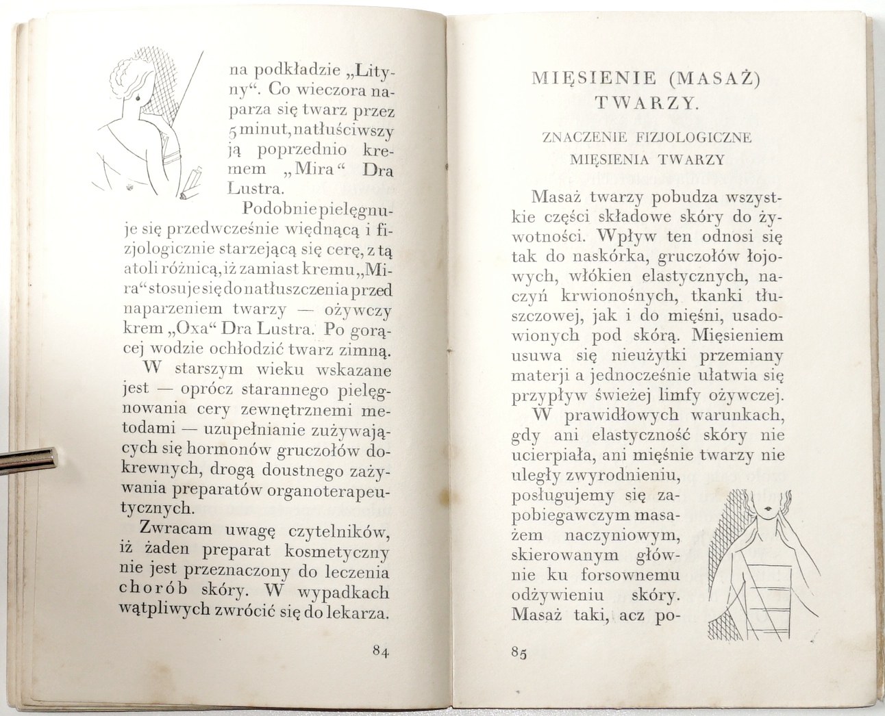 m.in. Źródła siły żywotnej. Ćwiczenia cielesne. Kąpiele słoneczne. Zwalczanie samozatrucia organizmu. Odmładzanie hormonami gruczołów dokrewnych. Odmładzanie emanacją ciał radioczynnych. Pielęgnowanie urody. Budowa skóry. Właściwości cery. Kilka słów o znaczeniu najważniejszych preparatów kosmetycznych. Mydło. Otrąbki migdałowe. Proszek marmurowy "Miraculum". Puder. Róż roślinny. Krem. Cold Cream-Talkum. Mleczko-Lityna. Prodermoll. Sposób użycia "Prodermollu-Miraculum". Woda. Ciepło na usługach kosmetyki naturalnej. Zwalczanie tłustej właściwości cery.Pielęgnowanie prawidłowej cery. Pielęgnowanie suchej cery. Masaż twarzy. Znaczenie fizjologiczne mięsienia twarzy. Rozwój biustu. Pielęgnowanie rąk. Metoda masażu rąk. Włosy. Zabiegi fizykalne.