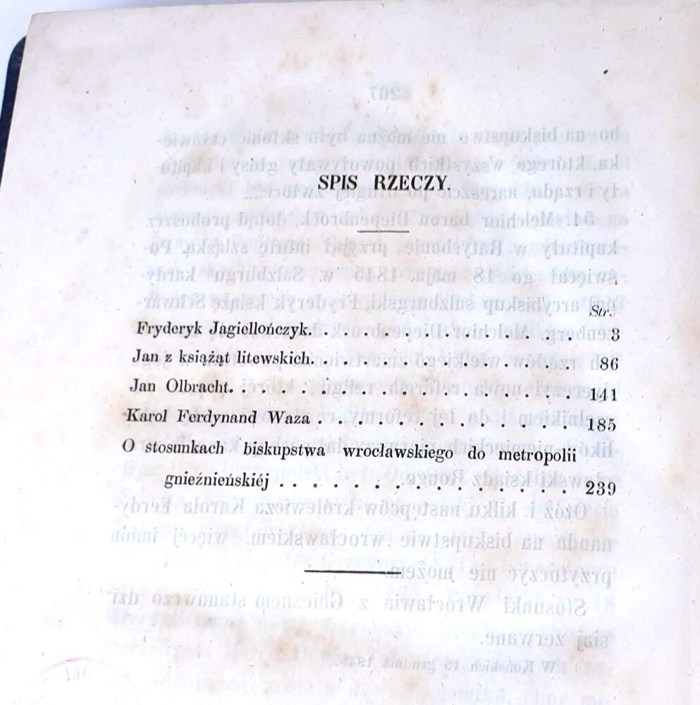 Zawiera żywoty: Fryderyka Jagiellończyka, Jana z książąt litewskich, Jana Olbrachta, Karola Ferdynanda Wazy oraz dział O stosunkach biskupstwa wrocławskiego do metropolii gnieźnieńskiej.