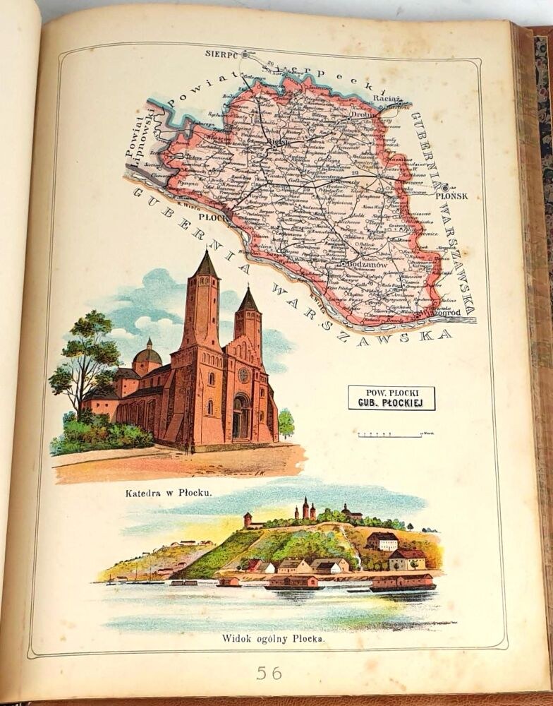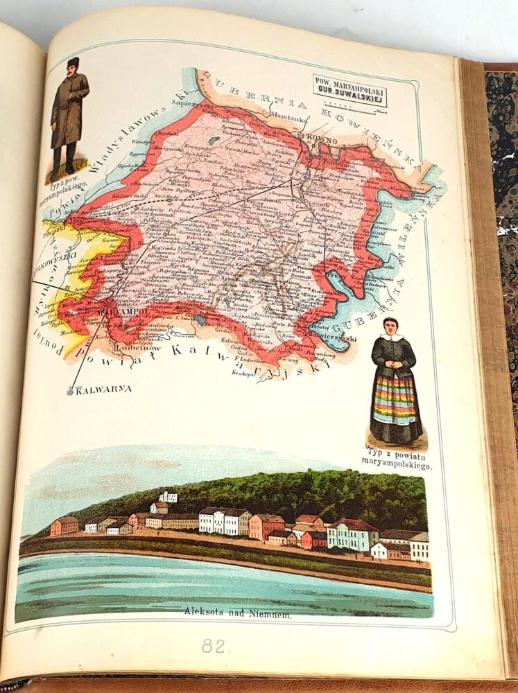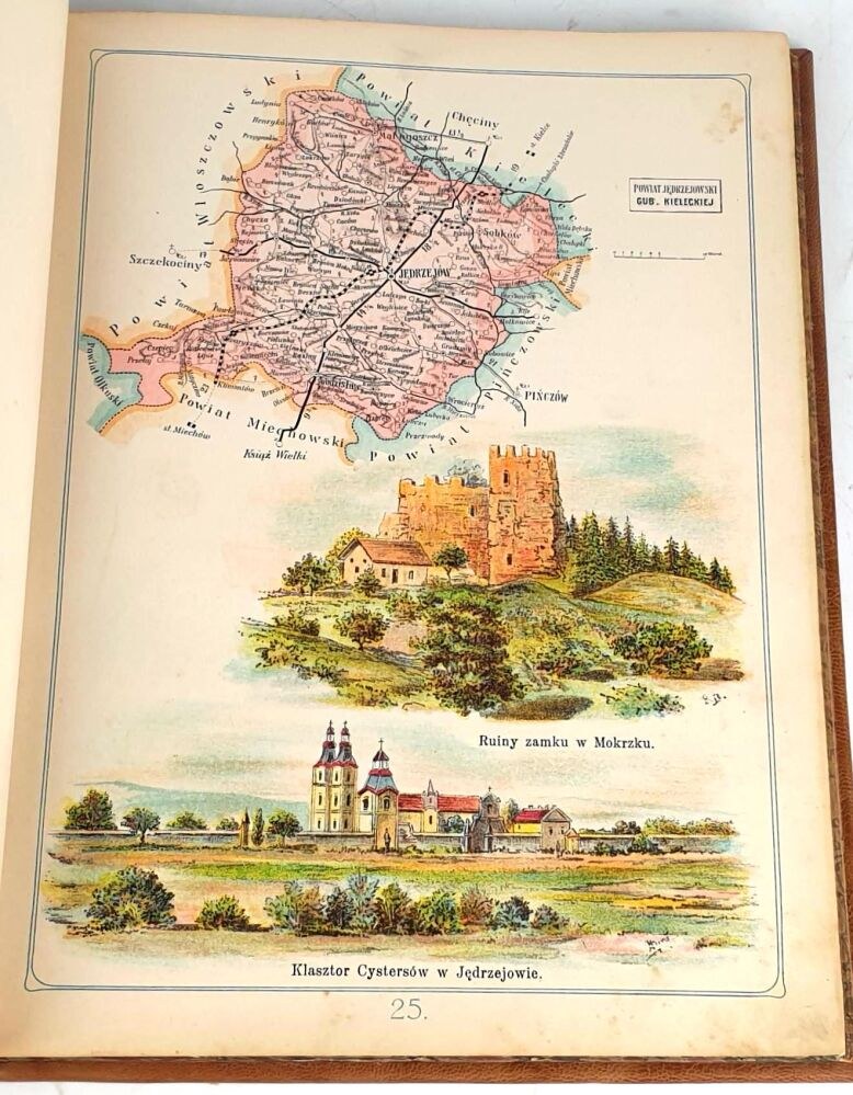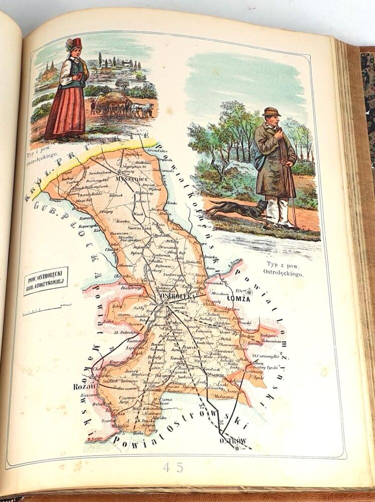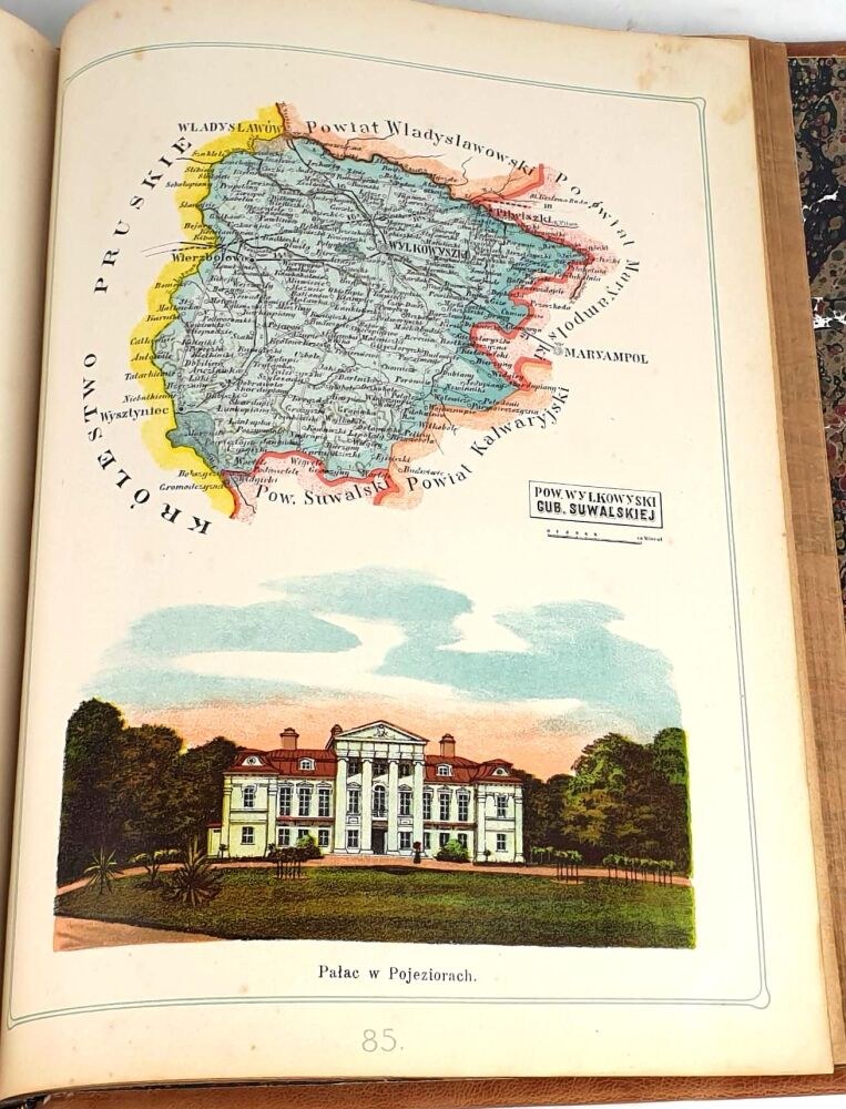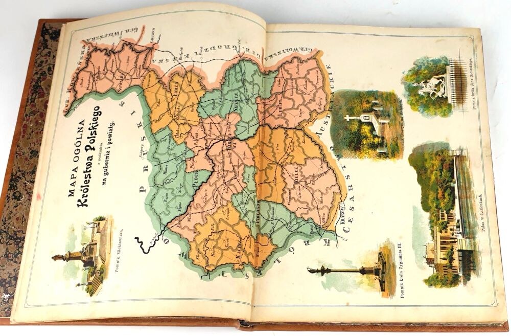 Zawartość: litografowana strona tytułowa, indeks, 1 dwustronicowa mapa Królestwa Polskiego, 85 map jednoarkuszowych z poszczególnymi powiatami, 118 stron z opisem powiatów, 2str. indeks miejscowości