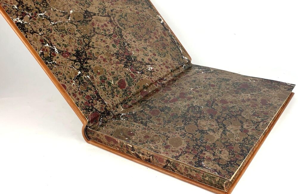 TWARDA OPRAWA PEŁNA SKÓRA WSPÓŁCZESNA WZOROWANA NA OPRAWIE WYDAWNICZEJ Z EPOKI. EFEKTOWNE ZŁOCENIA O STYLISTYCE SECESYJNEJ NA LICU I GRZBIECIE. WYKLEJKI RĘCZNIE MARMORYZOWANE. OBCIĘCIA KART ZŁOCONE