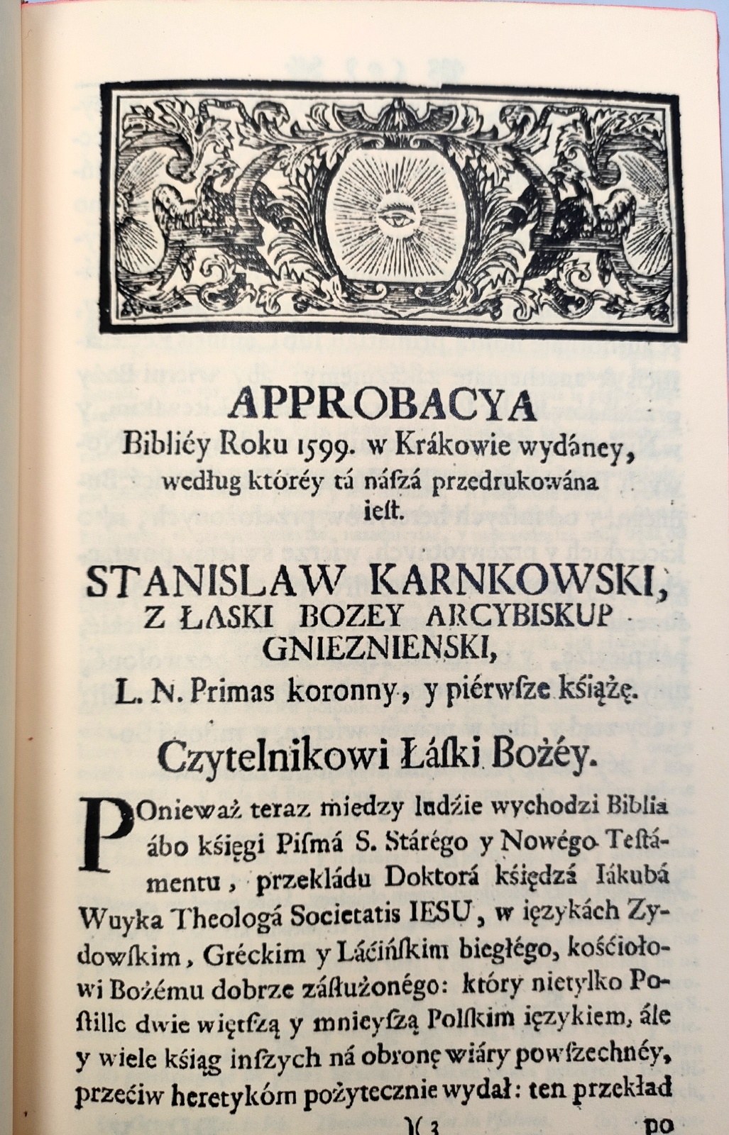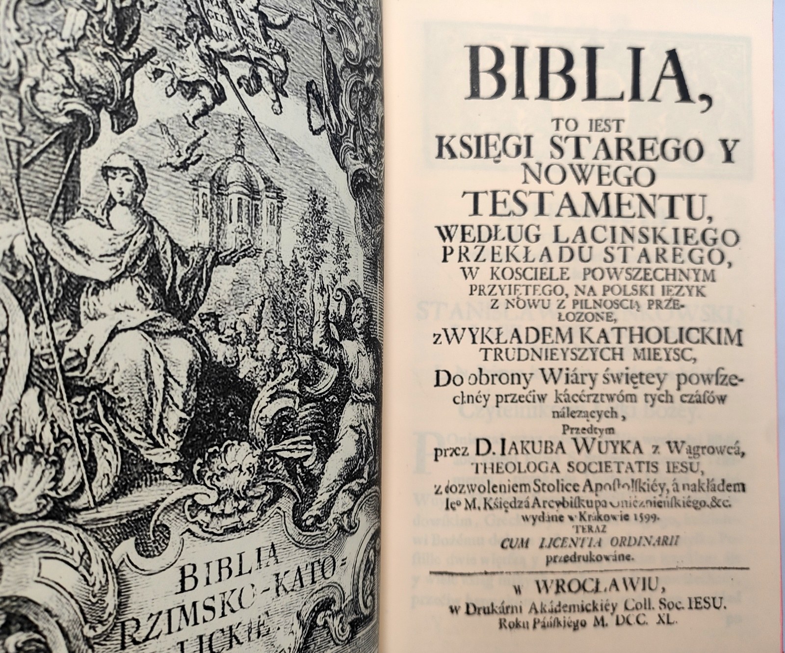 Biblia to jest Księgi Starego y Nowego Testamentu, według łacinskiego przekładu starego, w kościele powszechnym przyiętego, na Polski ięzyk z nowu z pilnością przełożone, z wykładek katholickim trudnieyszych mieysc, do obrony Wiary świętey powszechney przeciw kacerztwom tych czasów należących, przedtym przez D. Jakuba Wujka z Wągrowca, Theologa Societatis Iesu. z dozwoleniem Stolice Apostolskiey, a nakładem Jego M. Księdza Arcybiskupa Gnieźnieńskiego etc. wydane. w Krakowie 1599.[...]