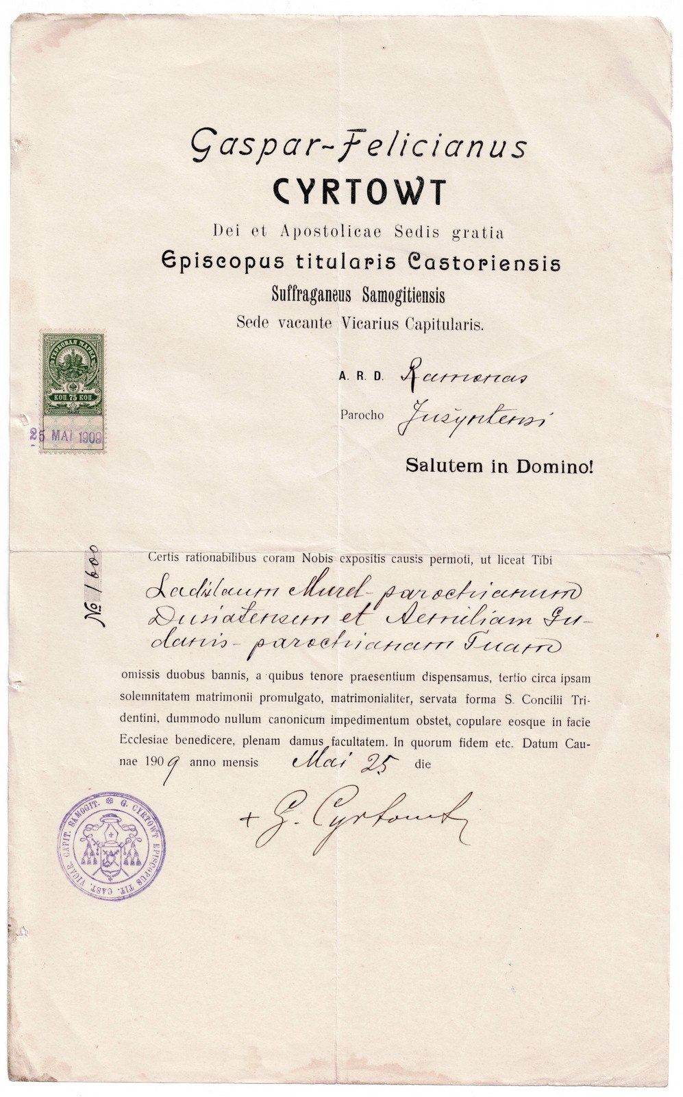 Žemaičių vyskupo leidimas Jūžintų klebonui sutuokti Vladislovą Murelį iš Duse- tų parapijos su Amelija Gudonyte iš Tuamo (?) parapijos. Spaudinys, rankraštis, Rusijos imperijos žyminio mokesčio ženklas 75 kap., vys- kupo antspaudas ir parašas, 36,5 x 22,5