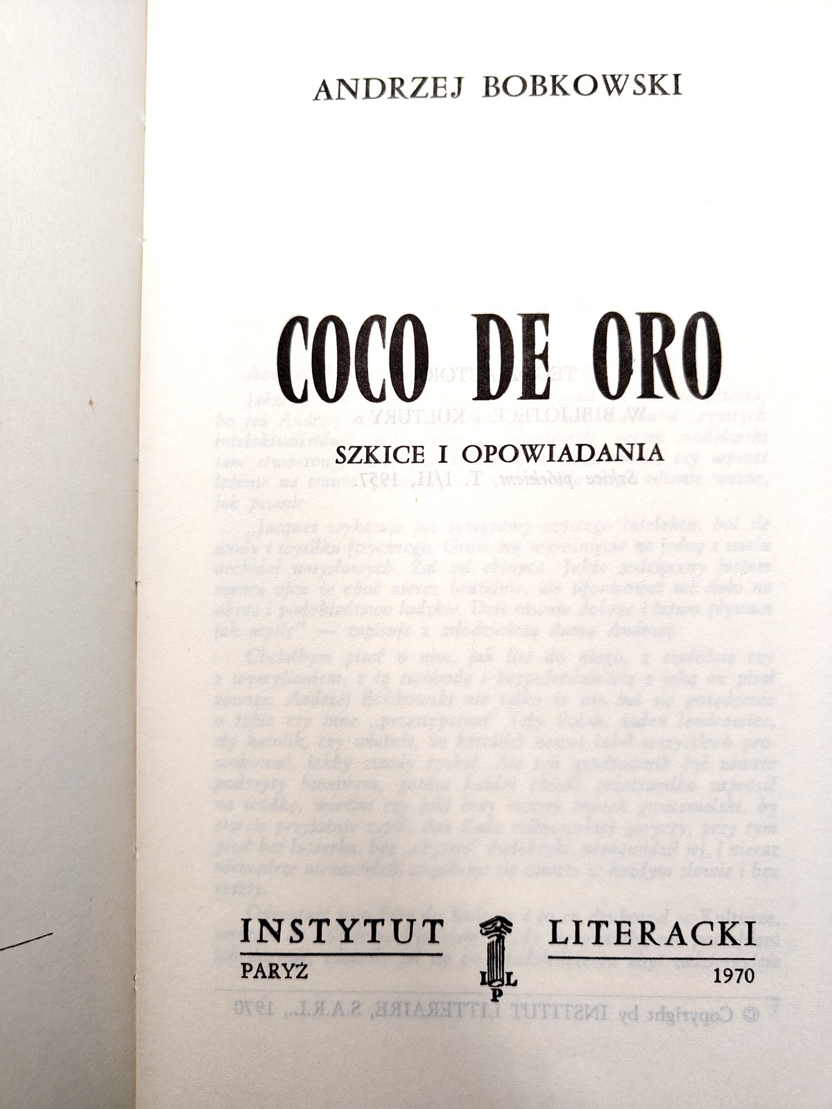 Bobkowski Andrzej - Coco de oro, szkice i opowiadania, Paryż 1970