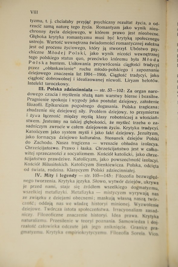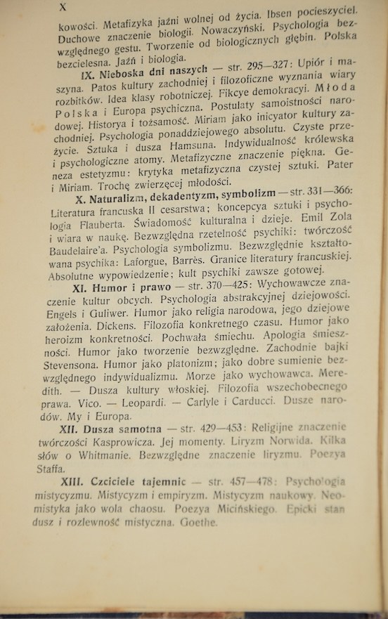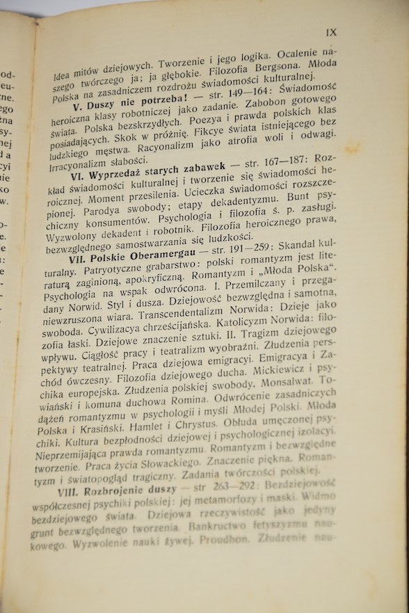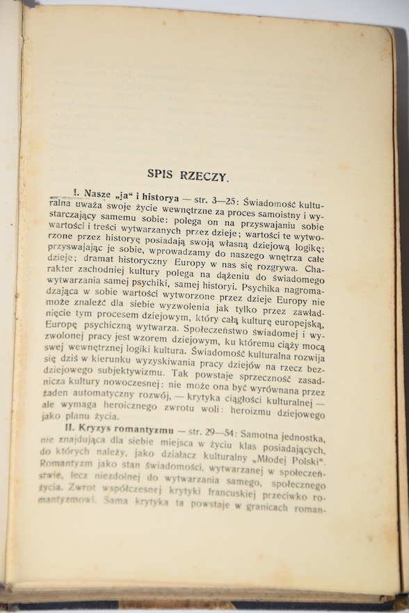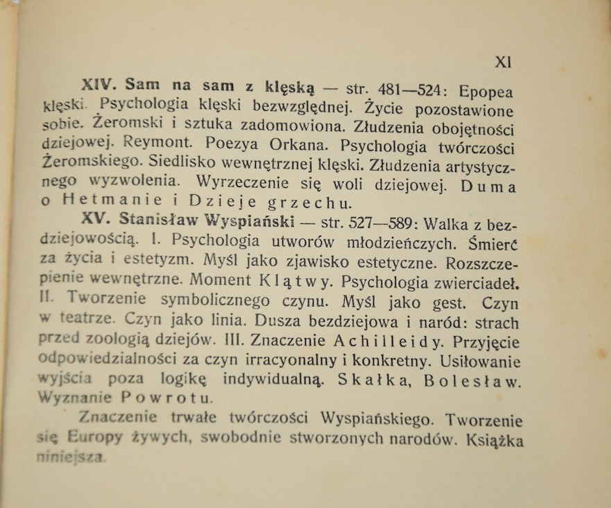 Zawiera rozdziały: Nasze "ja" i historja, Kryzys romantyzmu, Polska zdziecinniała, Mity i legendy, Duszy nie potrzeba!, Wyprzedaż starych zabawek, Polskie Oberamergau, Rozbrojenie duszy, Nieboska dni naszych, Naturalizm, dekadentyzm, symbolizm, Humor i prawo, Dusza samotna, Czciciele tajemnic, Sam na sam z klęską, Stanisław Wyspiański. Na końcu skorowidz nazwisk.