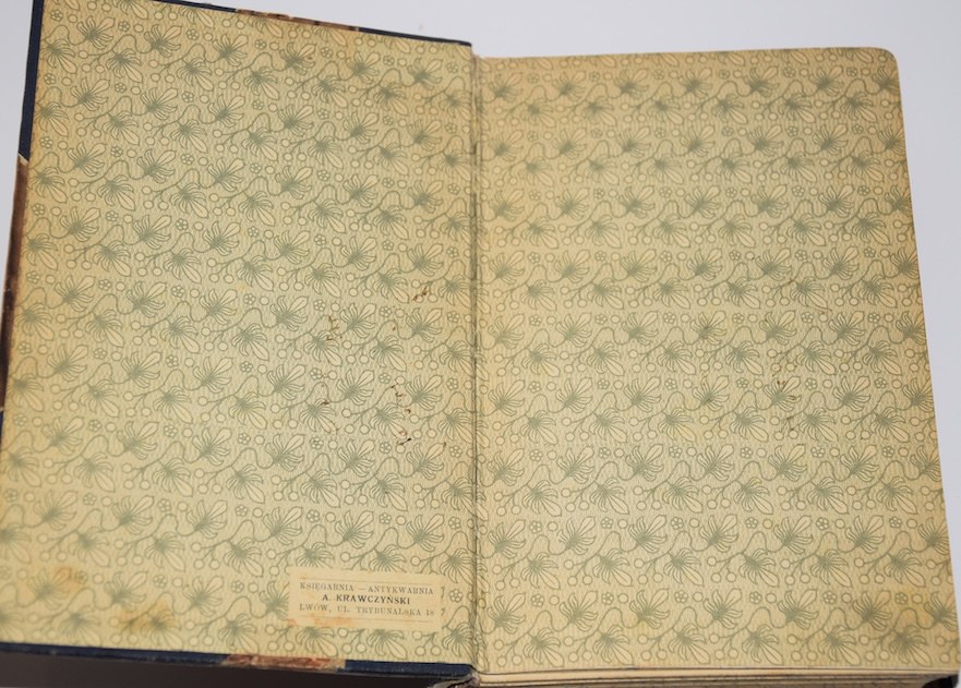 - Oprawa: twarda pół-płócienna, ozdobne wyklejki, marmoryzowane brzegi kart, na przedniej wyklejce nalepka: "Księgarnia - Antykwarnia A. Krawczyński Lwów, Ul. Trybunalska 18"