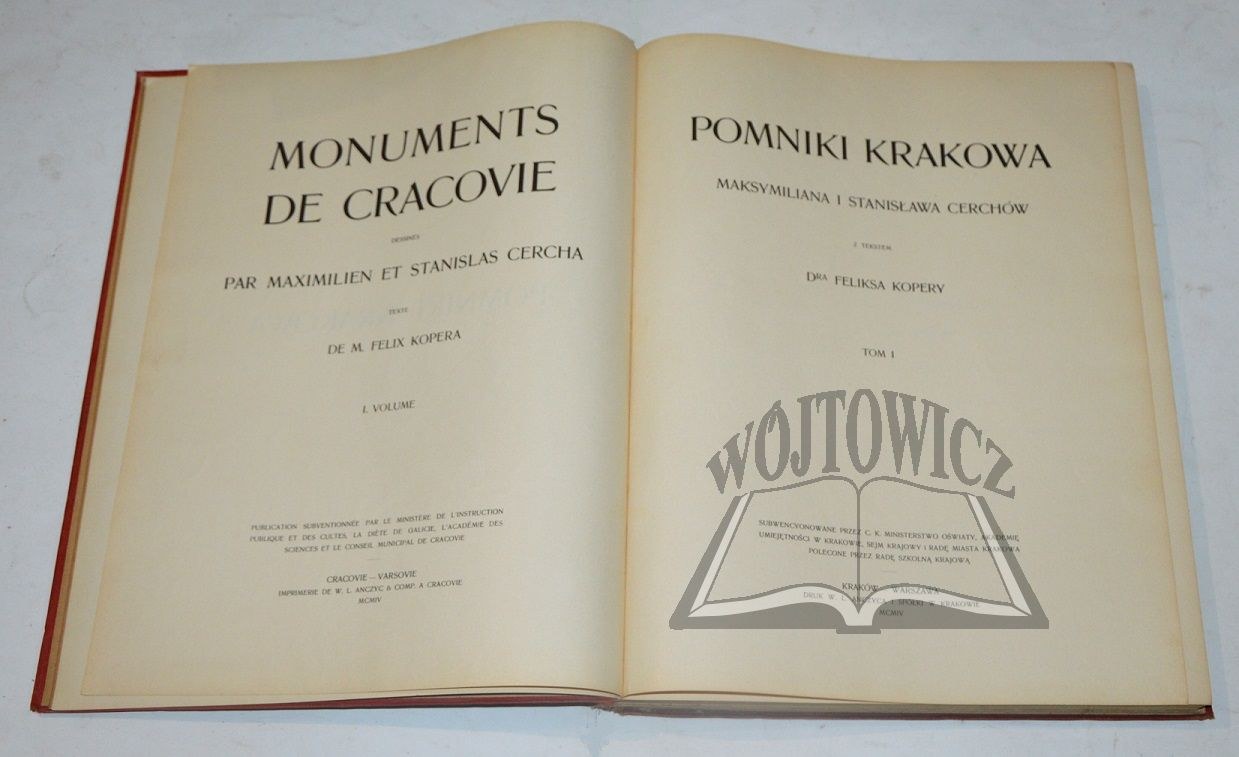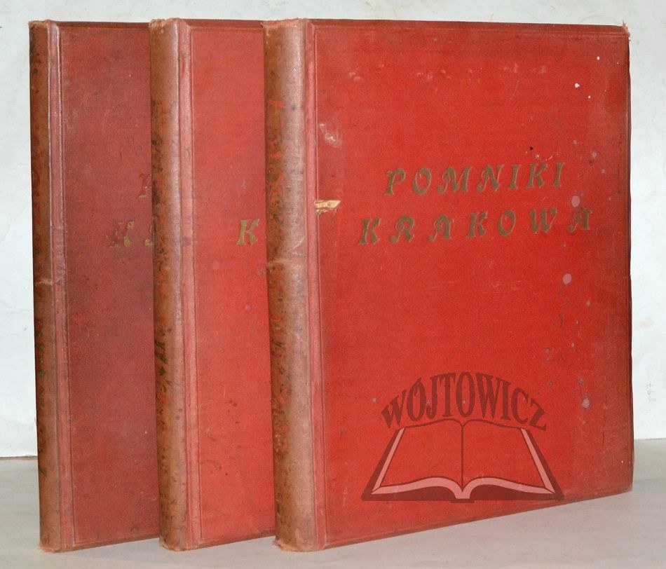Zabrudzenia i zaplamienia oraz przetarcia oprawy. Złocone napisy (częściowo wytarte) na licu i grzbiecie opraw. Stanisław Cercha (1867-1919), malarz i historyk sztuki wraz z ojcem Maksymilianem (1818-1907), archeologiem i rysownikiem wydał oferowane "Pomniki Krakowa" z rysunkami nagrobków krakowskich, wykonywanych już od roku 1846 przez ojca i jego samego.