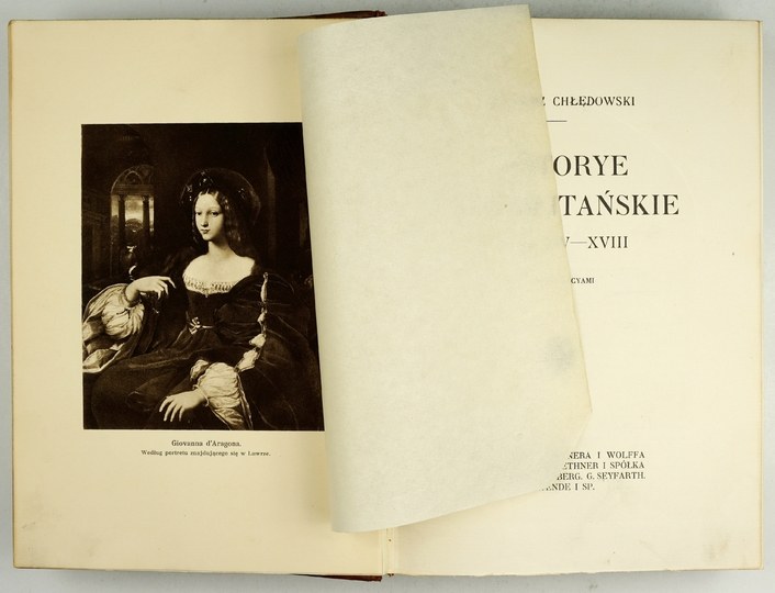 Grzbiet nieco otarty, stan dobry. Egz. zaw. 34 ilustr: 33 na tablicach, 1 na przedniej okł. broszurowej. Zaw. m.in.: Terra di Lavoro, Młodość Bocaccia, Dwie smutne królowe, Julia Gonzaga, Karol III Burbon, Królowa Marya Karolina.