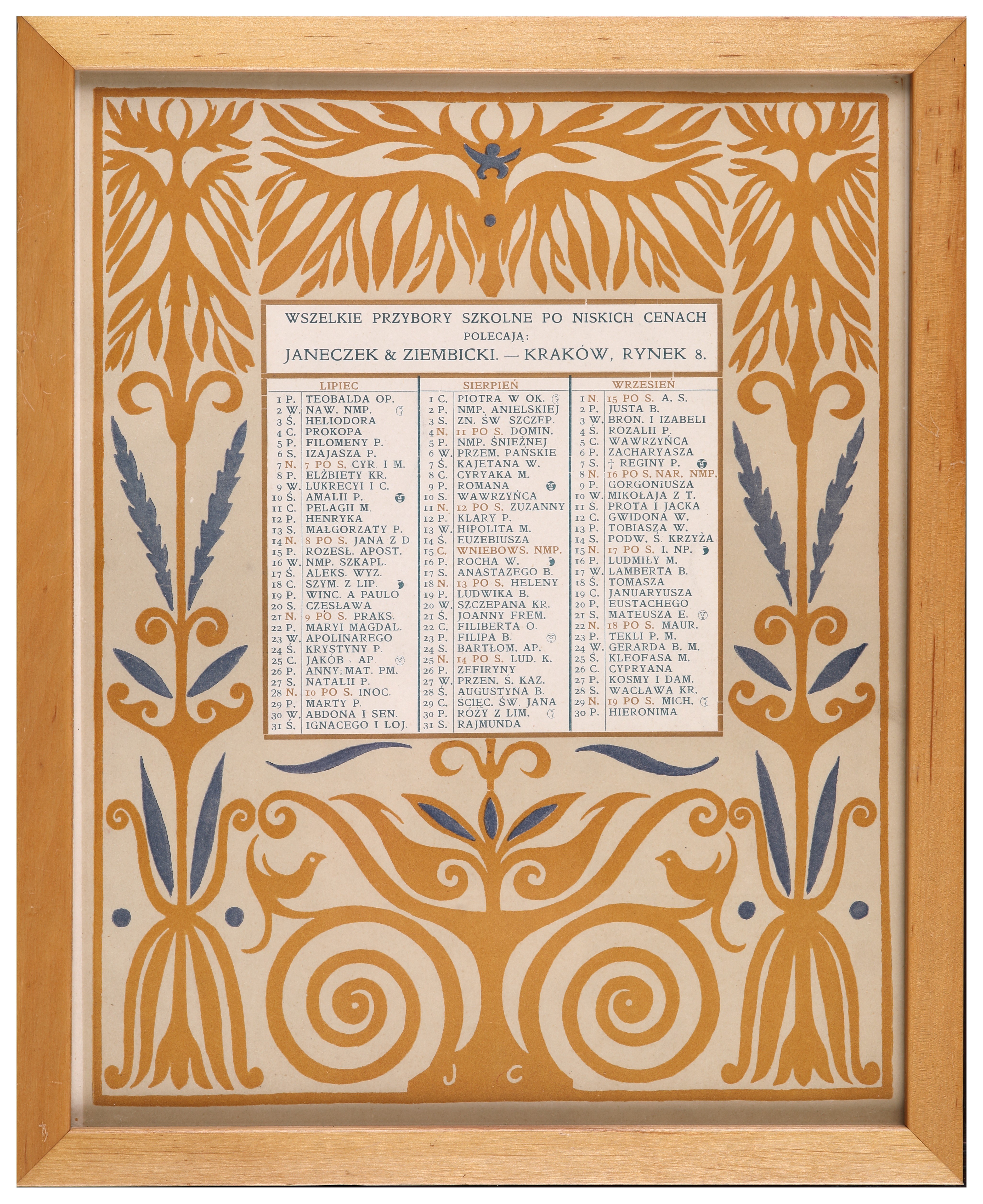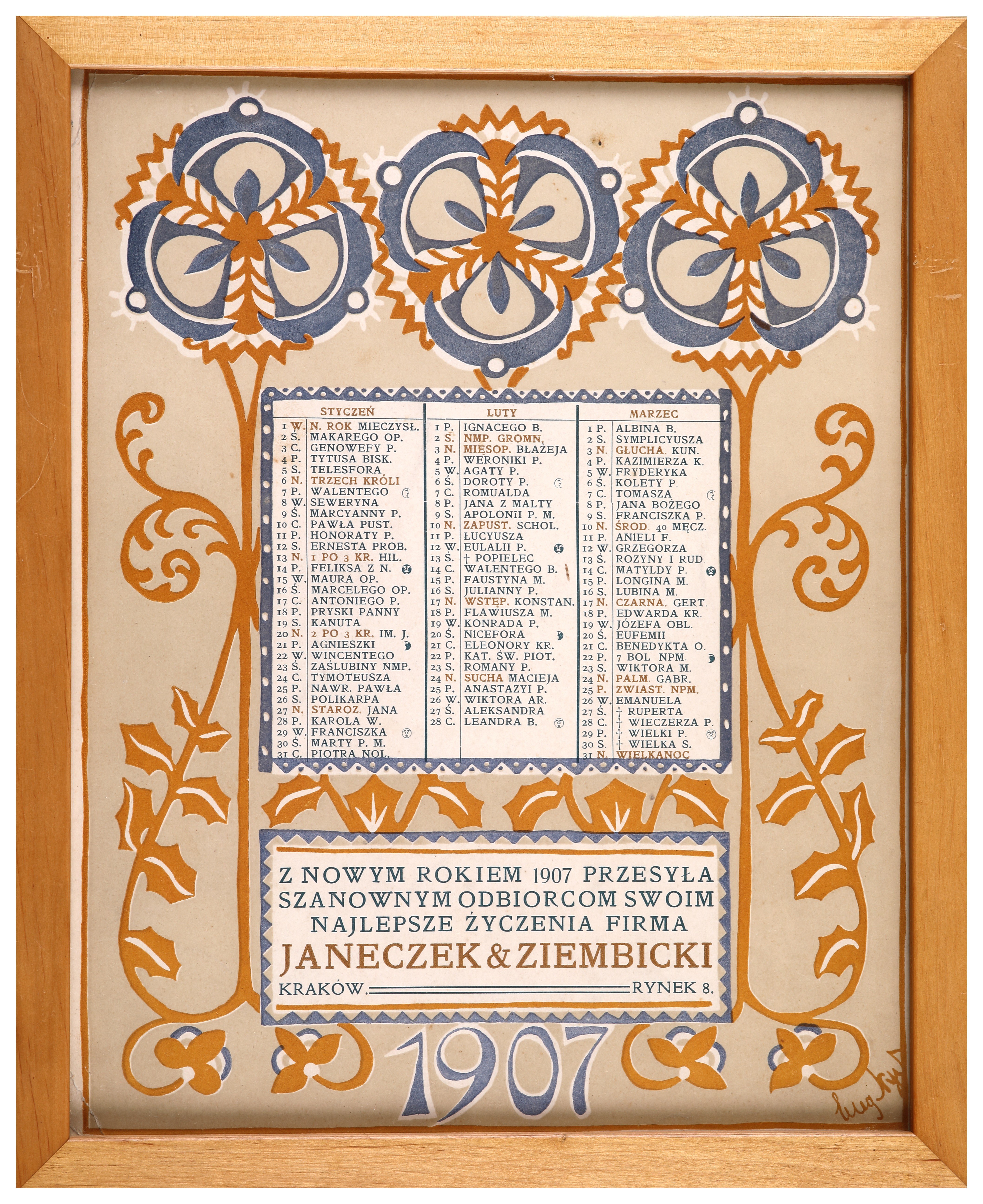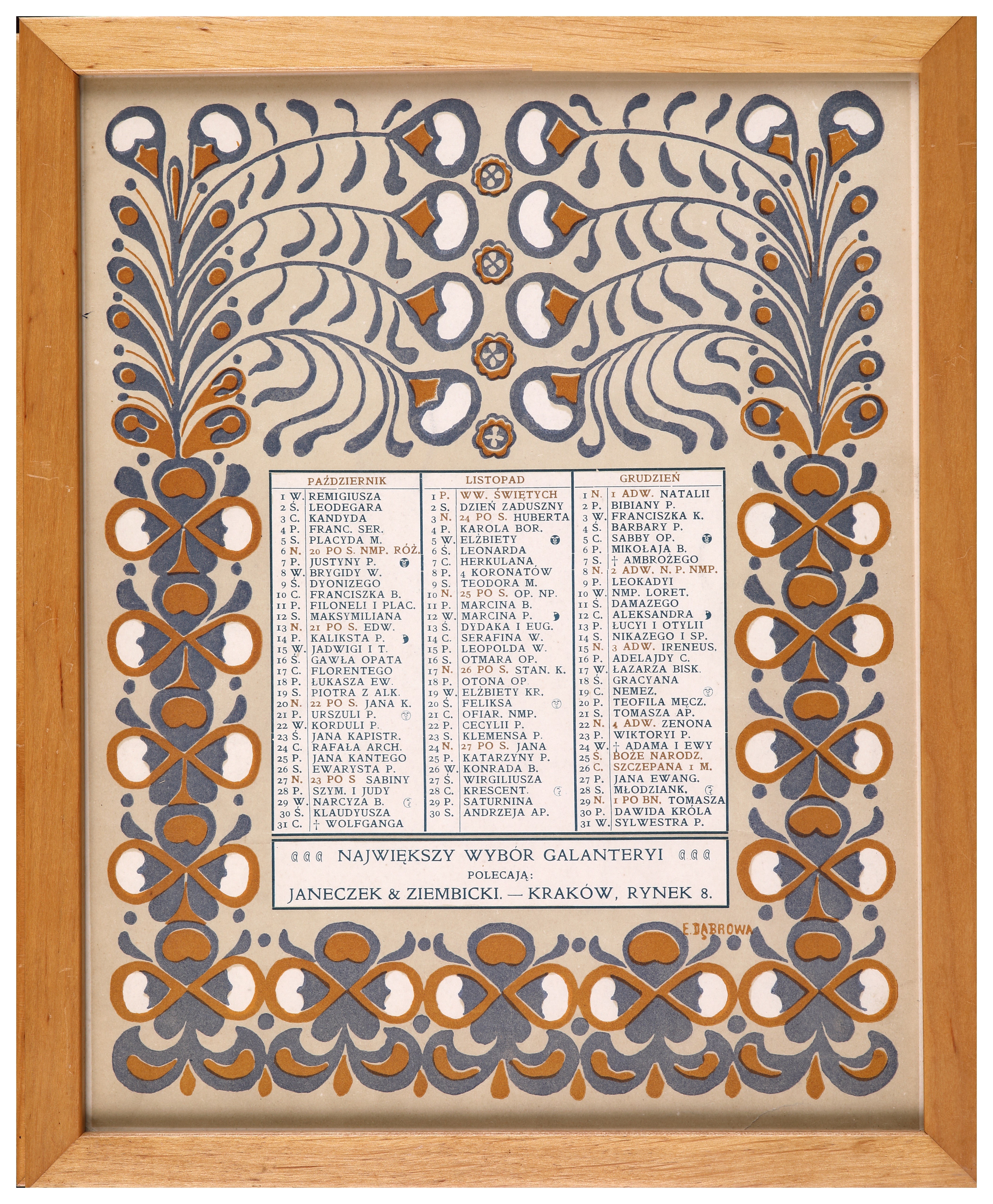 Odbijany w litografii barwnej kalendarz projektu Eugeniusza Dąbrowy i Józefa Czajkowskiego. Każdy kalendarz zawiera wykaz 3 kolejnych miesięcy. Wszystkie egzemplarze oprawione są w eleganckie, dębowe ramki.