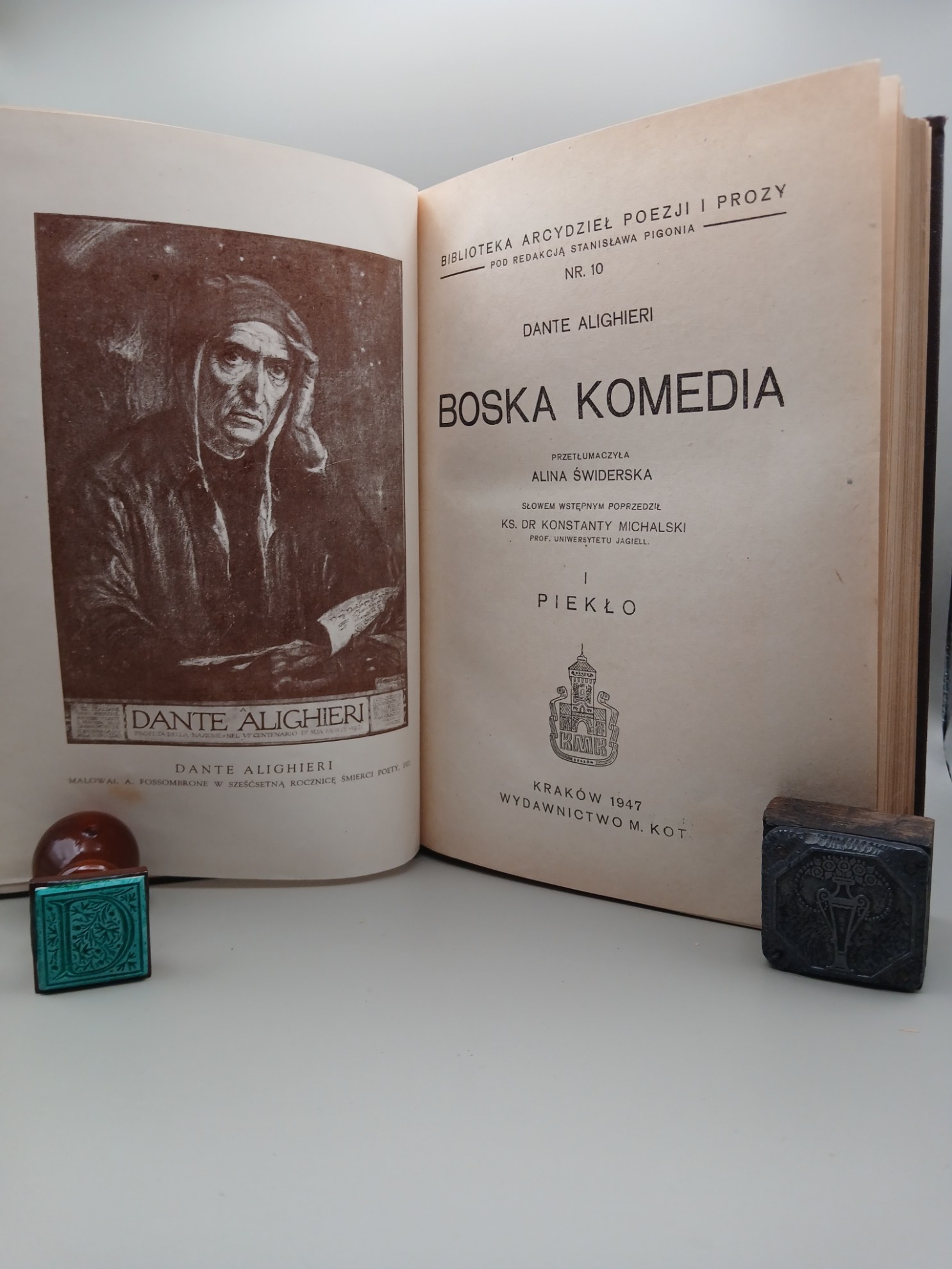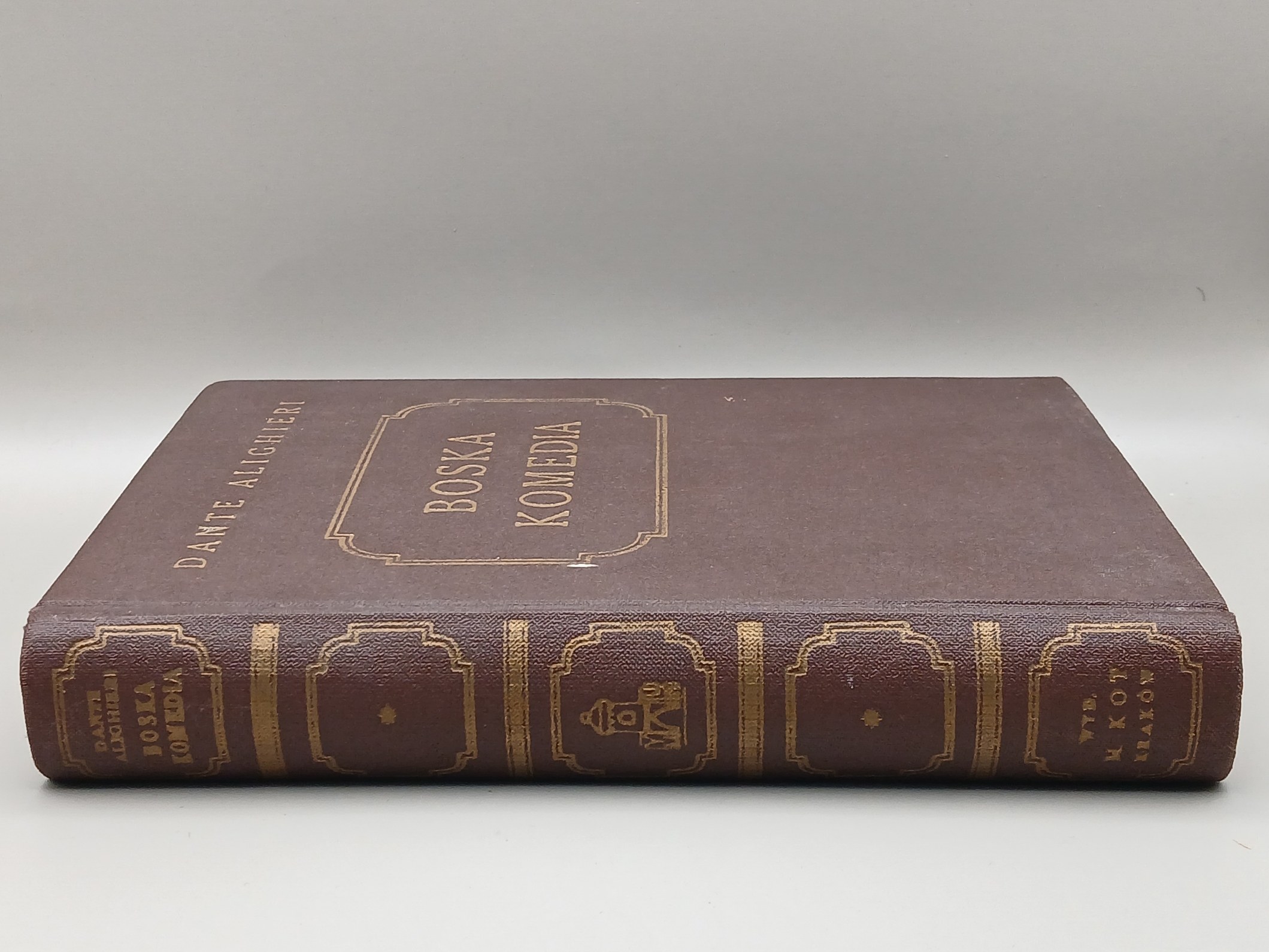 DANTE ALIGHIERI. BOSKA KOMEDIA. PRZETŁUMACZYŁA ALINA SWIDERSKA. SŁOWEM WSTĘPNYM POPRZEDZIŁ KS. DR KONSTANTY MICHALSKI. KRAKÓW 1947, WYDAWNICTWO M. KOT. 21 x 15,5cm; s.190; 184; 184; oprawa wydawnicza pełne płótno. Niewielkie ślady zalania, poza tym stan dobry.