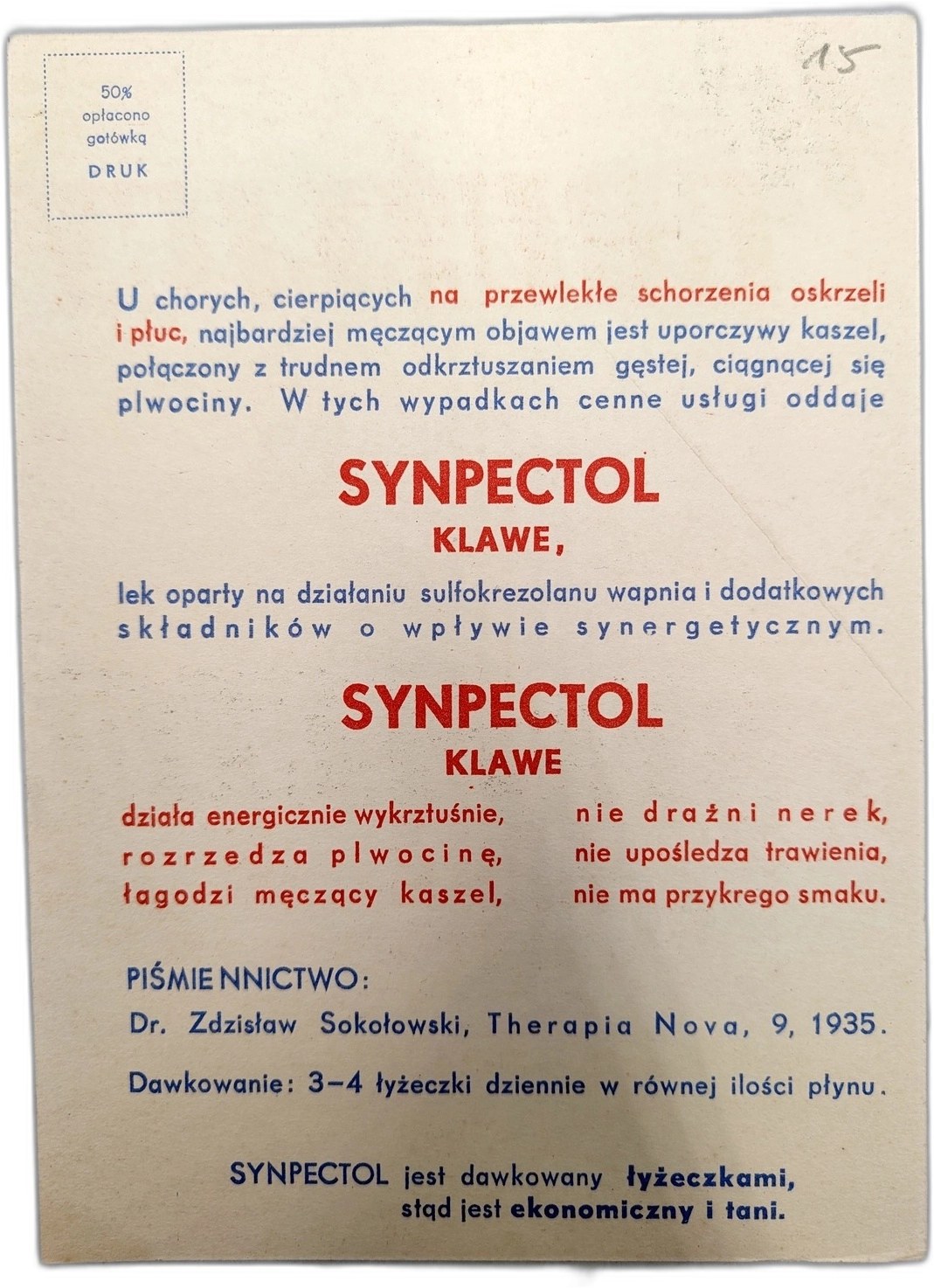 Druk reklamowy - Firmy Klawe -Synpectol - lek na gruźlicę, Litografia artystyczna W. Główczewski Warszawa