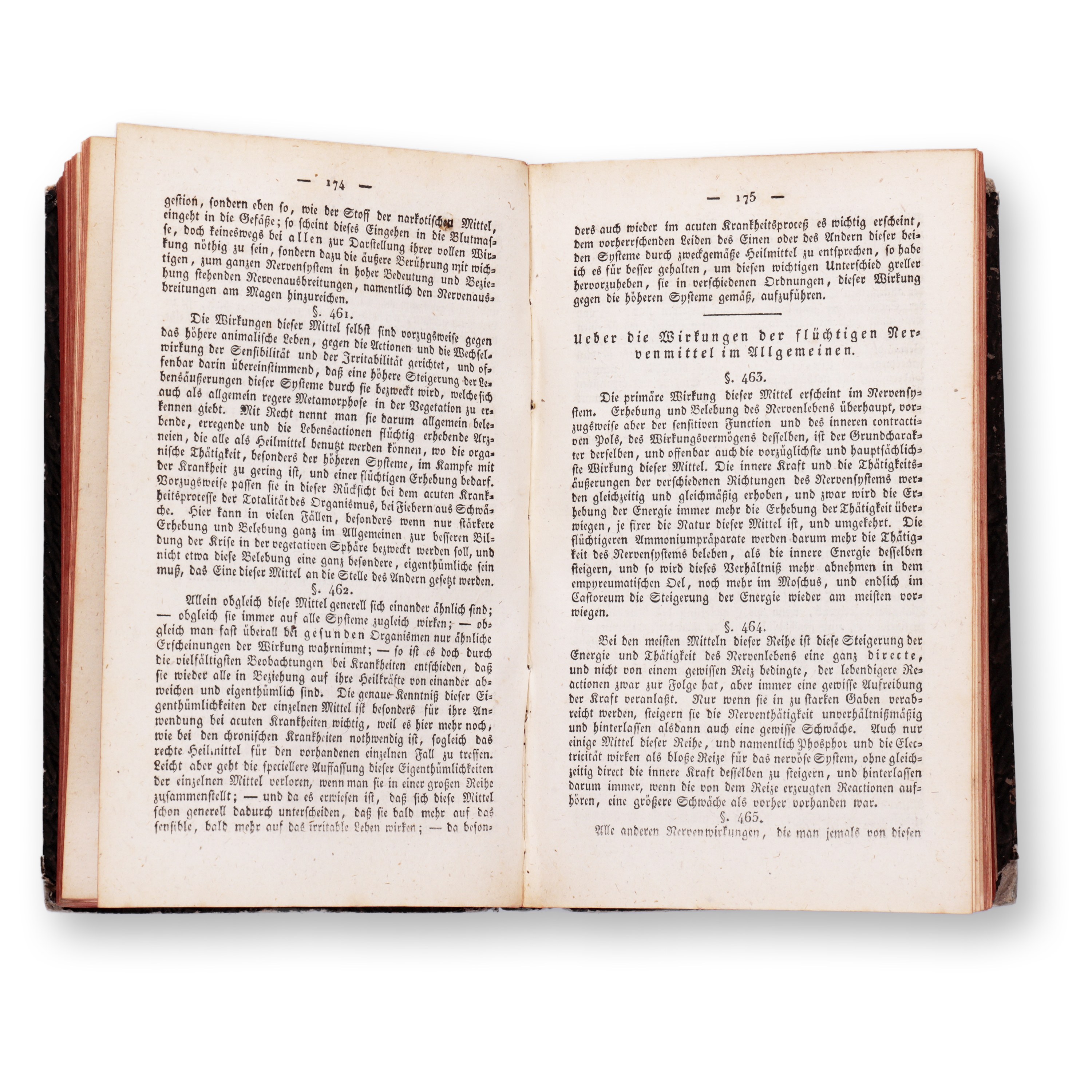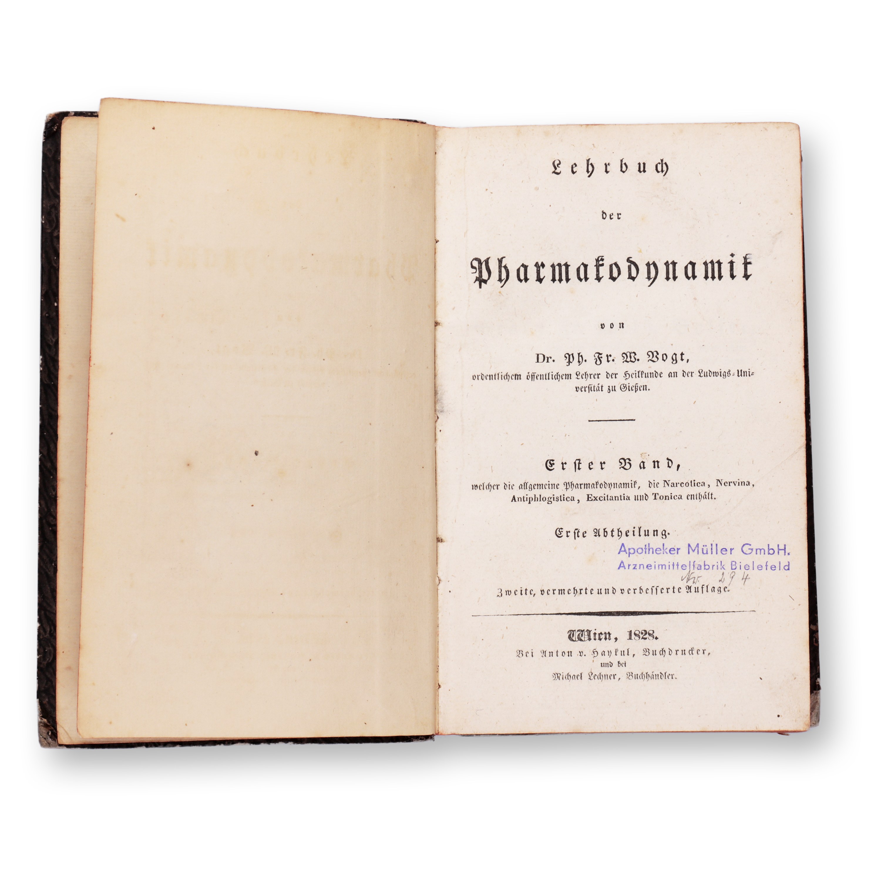 1828 | PUBLISHER: Vienna, Anton von Haykul | NUMBER OF PAGES: 648 | LANGUAGE: German | DIMENSIONS: 195 x 125 mm | THE FULL TITLE OF THE WORK: Lehrbuch der Pharmakodynamik. Erster Band | NOTE: ex libris Apotheker Muller | CONDITION: scratched spine