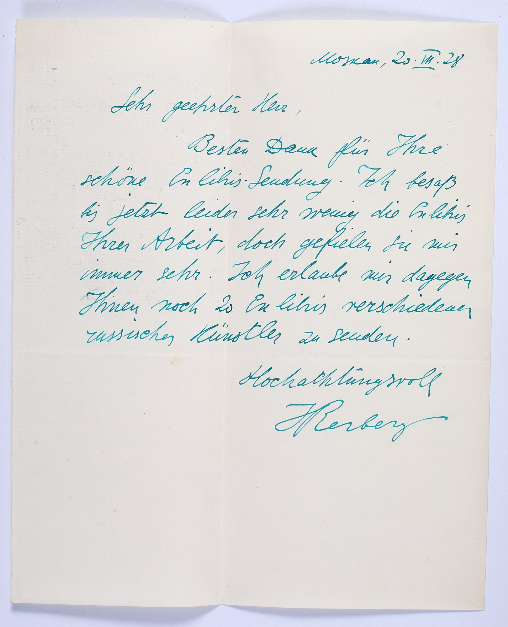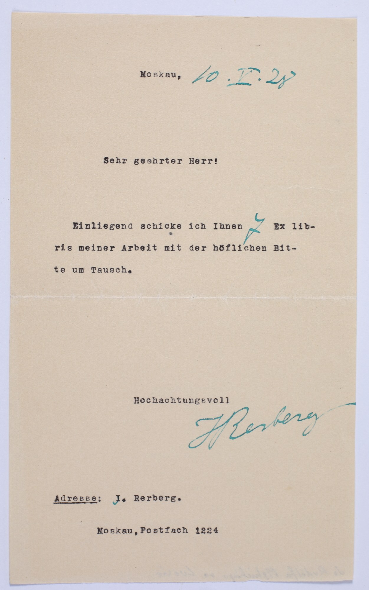 - korespondencję J. Rerberga (odręczny list dat. 20.VII.28 oraz maszynopis dat. 10.V.28] w sprawie przesłania ekslibrisów oraz wymiany kolekcjonerskiej