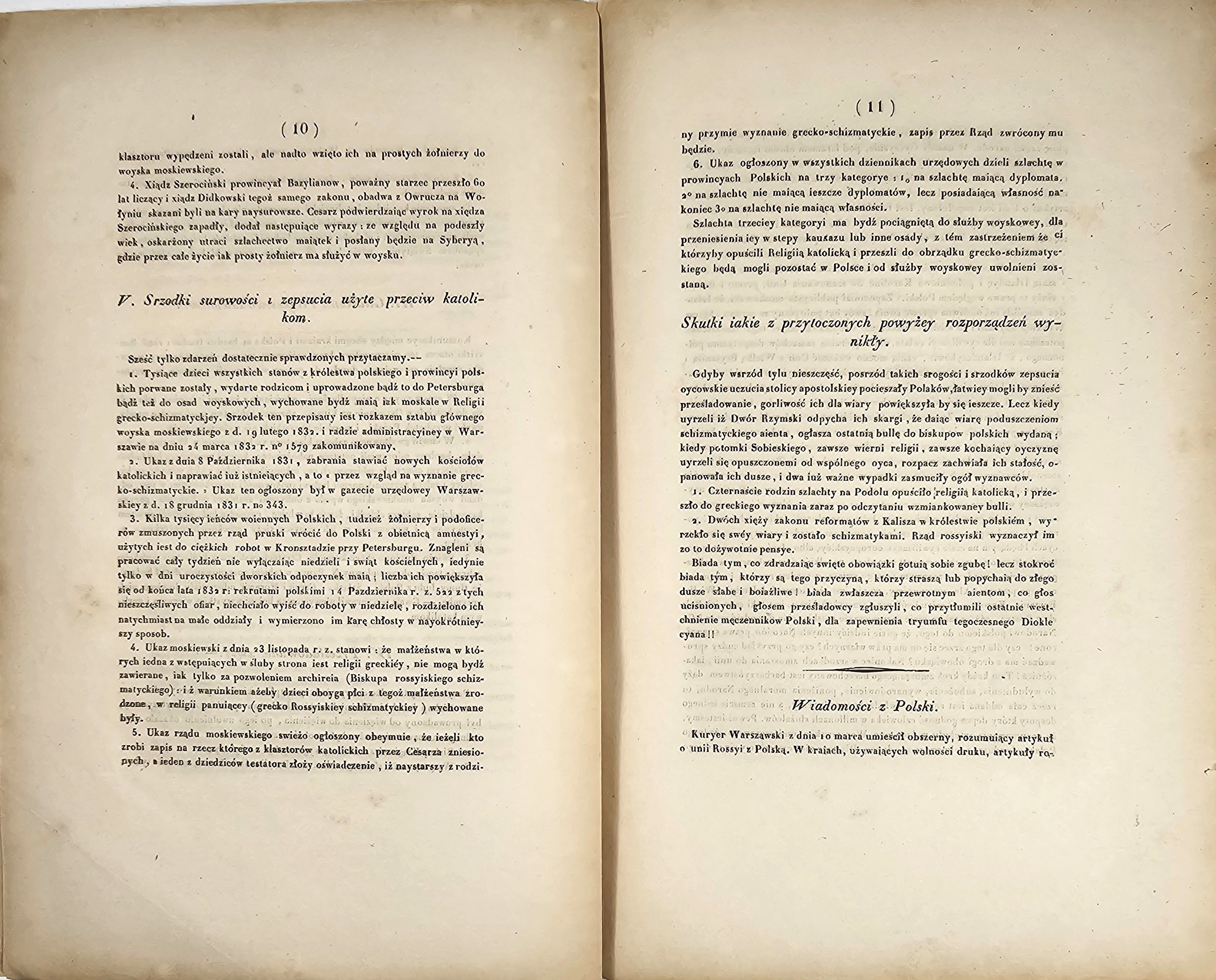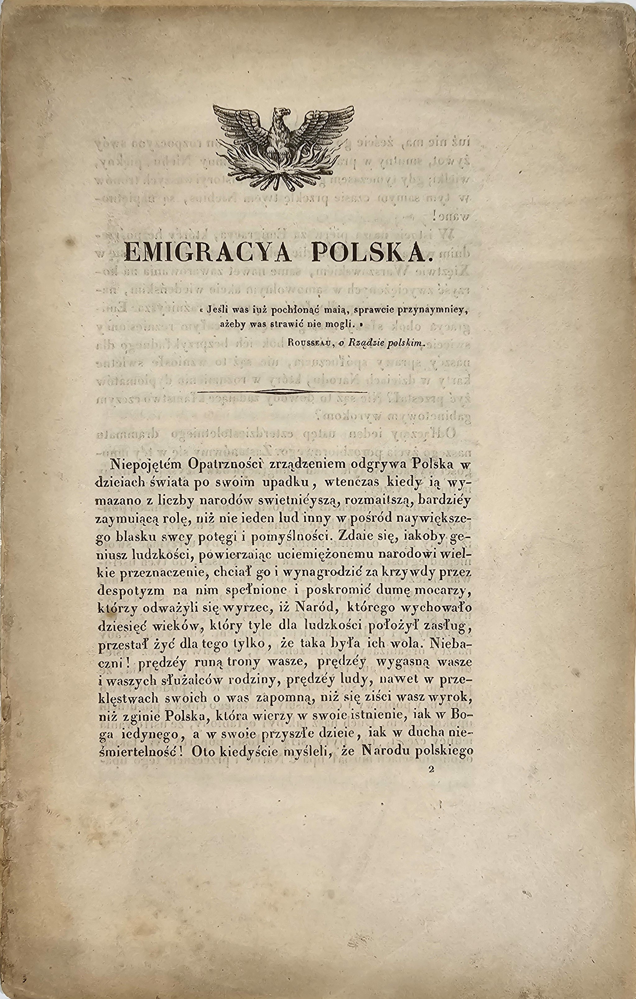 21.5 cm, s. 16, broszura. Stan dobry. Broszura ogłoszona w Paryżu d. 11 kwietnia 1833. Treść: [O pierwszej Emigracji polskiej], Prześladowanie relogii katolickiej w Polsce. (Zasady rządu w przedmiocie Religii. Zniesienie klasztorów i kościołów. Gwałcenie i łupiestwo kościołów. Prześladowanie księży. Środki surowości i zepsucia użyte przeciw katolikom). Wiadomości z Polski. Ważniejsze wypadki polityczne.