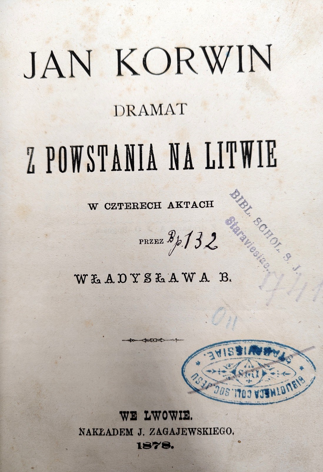 Euelfeld Bolesław [ Władysław B.] - Jan Korwin - dramat z powstania na Litwie, Lwów 1878