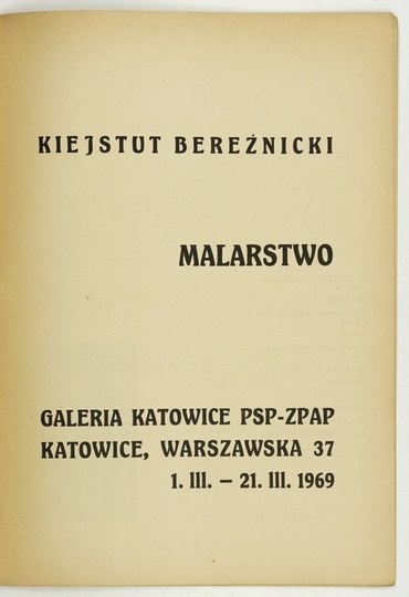 Galeria Katowice PSP-ZPAP. Kiejstut Bereźnicki. Malarstwo. Katowice, III 1969. 4, s. [16]. brosz.
