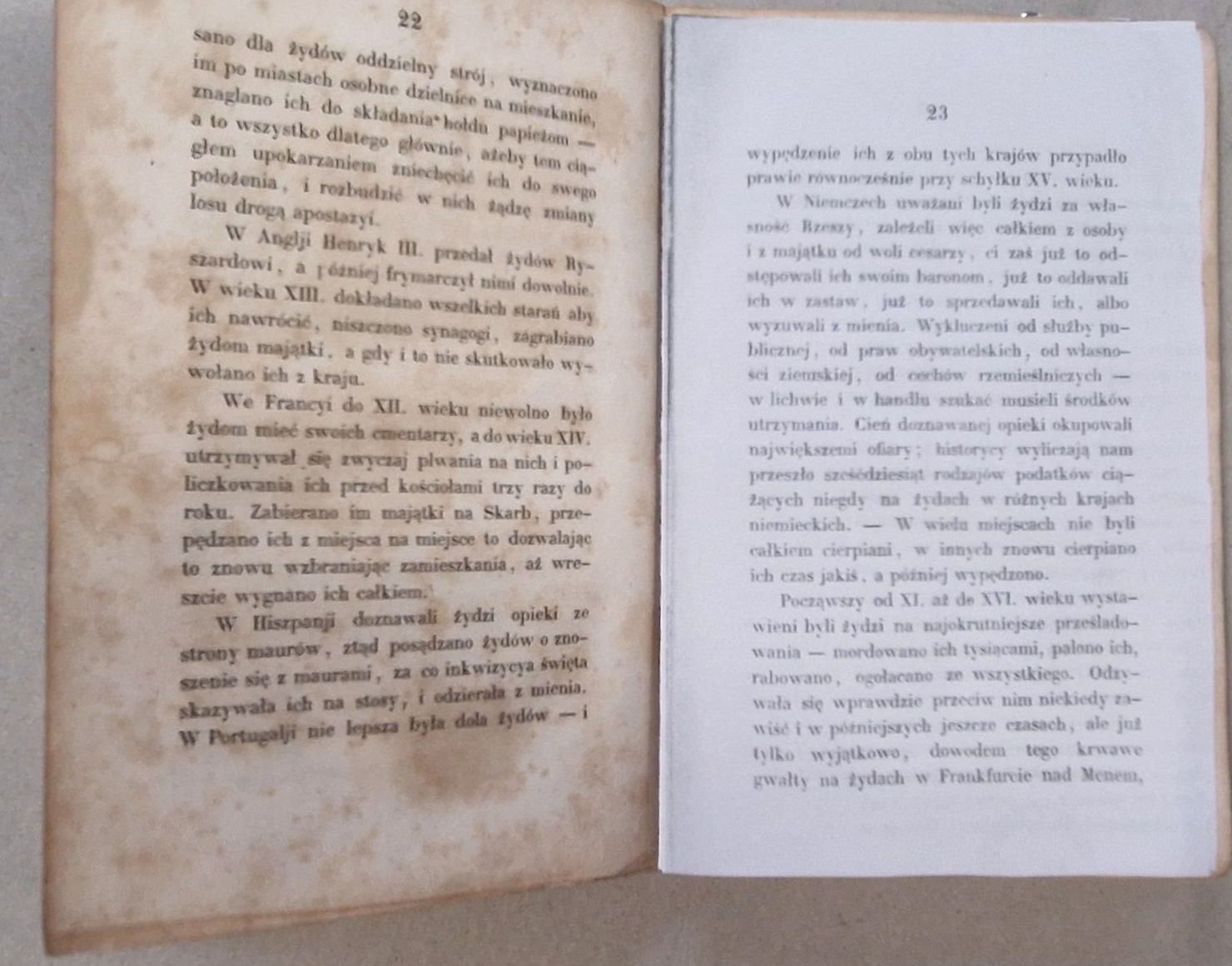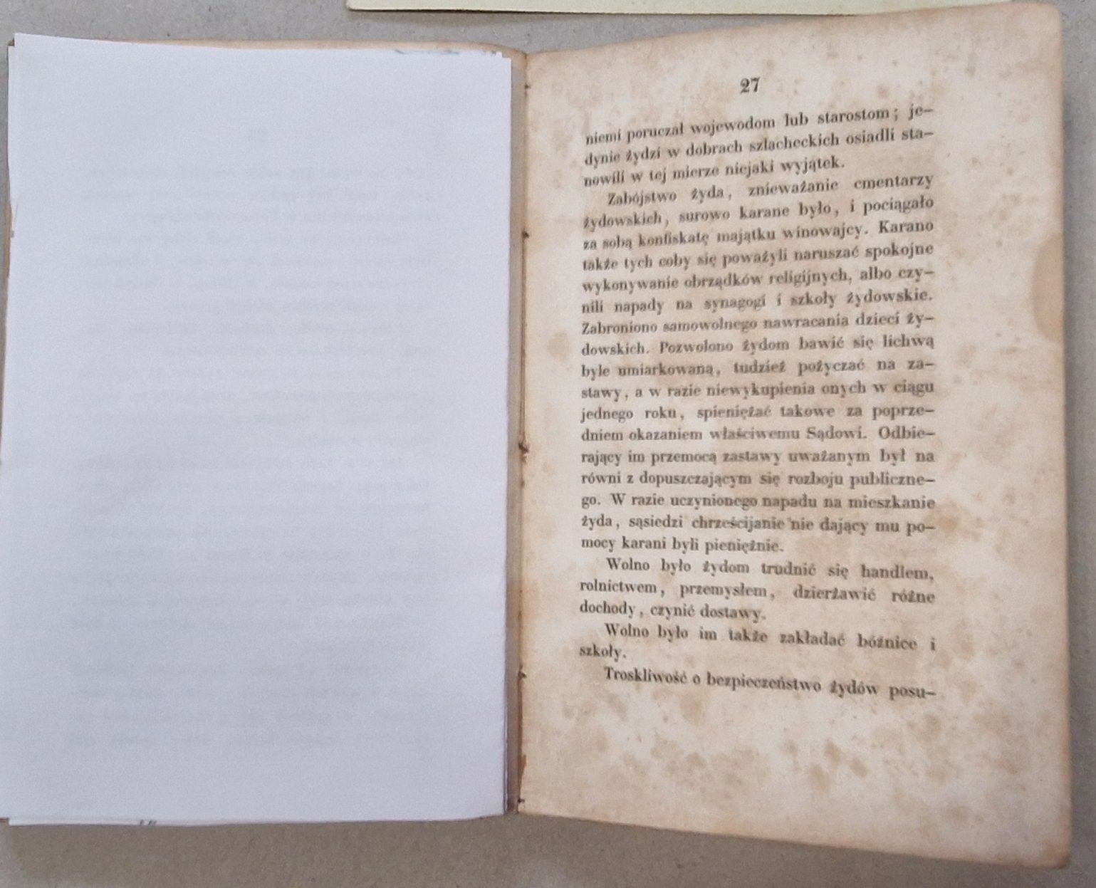 2 dzieła w jednym tomie. Wspólna oprawa półpł. Brak 4 str. (uzupełniono kserem) w Kwestyi reformy Żydów.