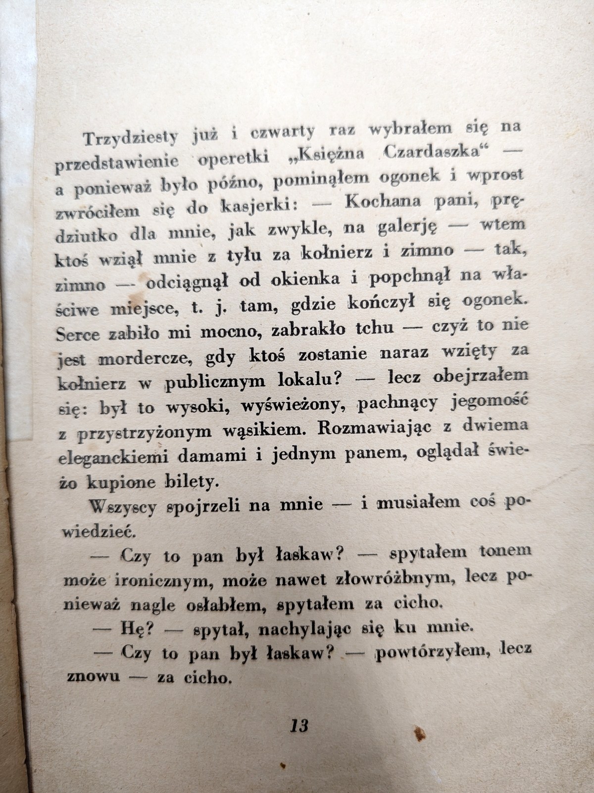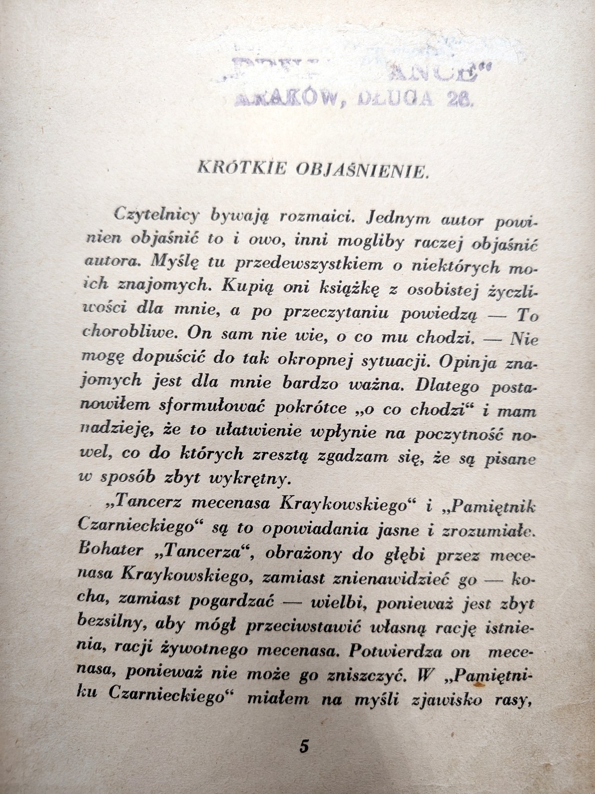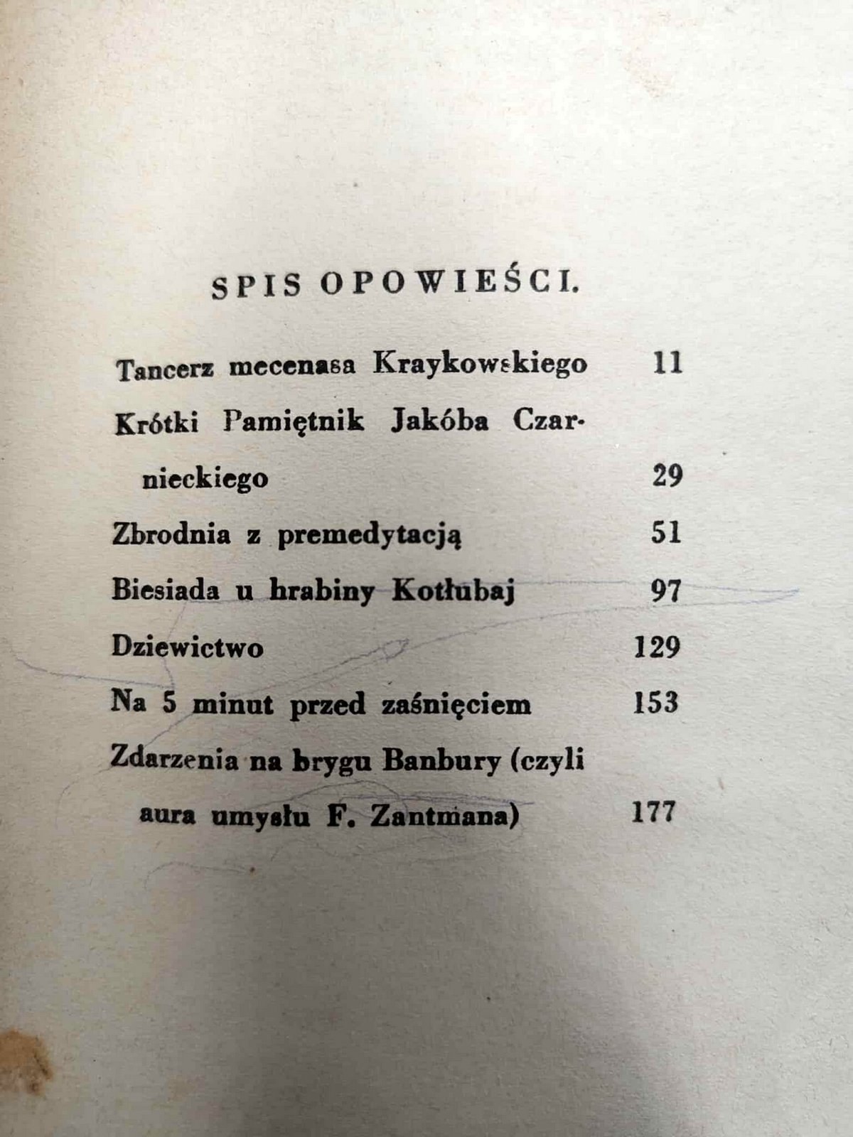 Zawiera : Tancerz mecenasa Kraykowskiego, Krótki pamiętnik Jakuba Czarnieckiego, Zbrodnia z premedytacją, Biesiada u hrabiny Kotłubaj, Dziewictwo, 5 minut przed zaśnięciem, Zdarzenia na brygu "Banbury" (czyli aura umysłu F. Zentmana)