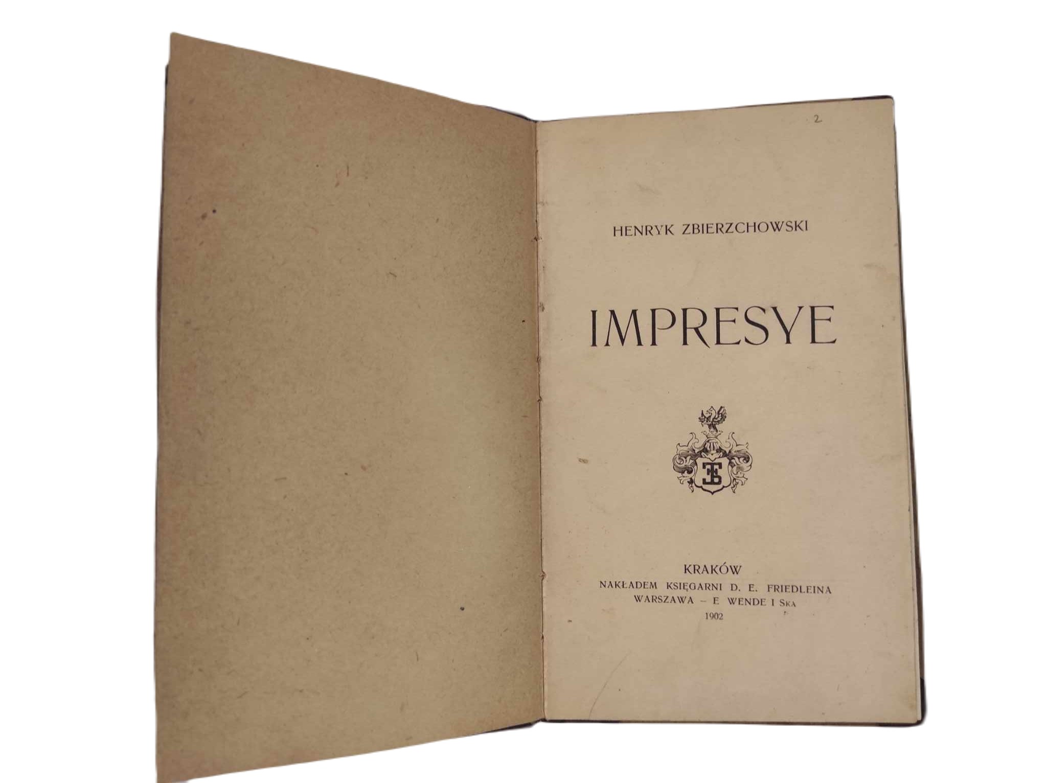 Henryk ZBIERZCHOWSKI Impresye Kraków Warszawa 1902 Nakładem Księgarni D. E. Friedleina E. Wende 90, [6] s. o. półpłócienna Obcięcia kart marmurkowane s. bdb, brak strony przedtytułowej, na wyklejce wklejony ex libris Władysława Rutkowskiego For. ca: 16x9,5 cm |