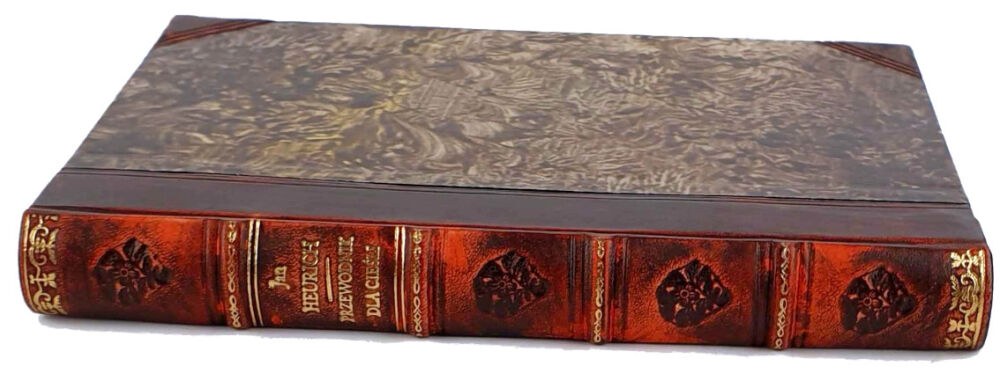 TWARDA OPRAWA PÓŁSKÓREK WSPÓŁCZESNY, GRZBIET Z WYPUKŁYMI ZWIĘZAMI, TŁOCZENIAMI I ZŁOCENIAMI, KARTON MARMORYZOWANY. WSZYSTKIE OBCIĘCIA KART BARWIONE