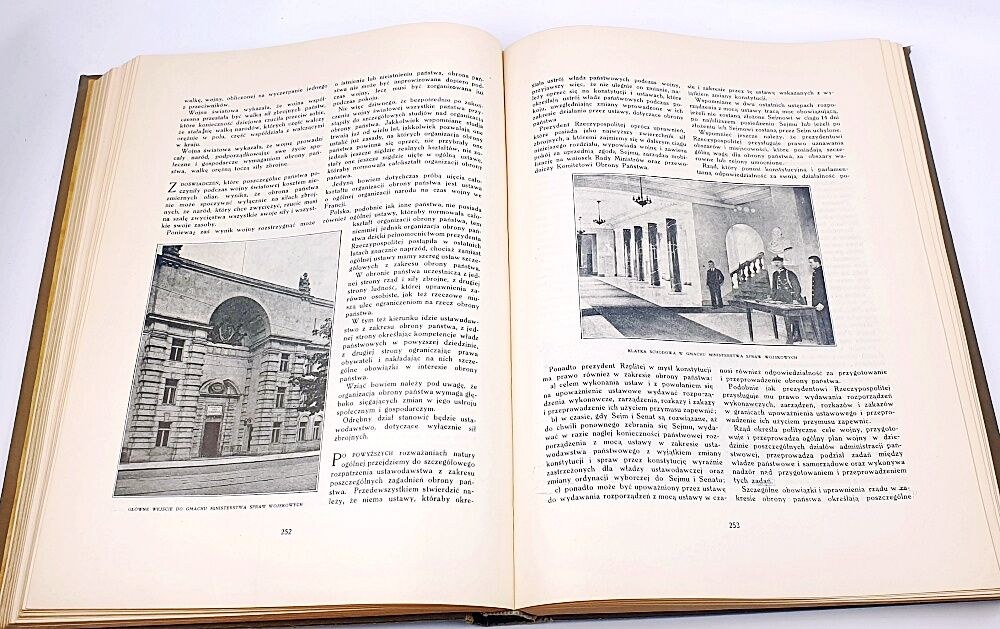 TWARDA OPRAWA WYDAWNICZA Z EPOKI, NA LICU TYTULATURA ZWIEŃCZONA PANOPLIĄ I OTOCZONA BODIURĄ POWSTAŁĄ Z BIAŁO- CZERWONYCH WSTĘG. OZDOBNE WYKLEJKI Z MODERNISTYCZNYM ORŁEM