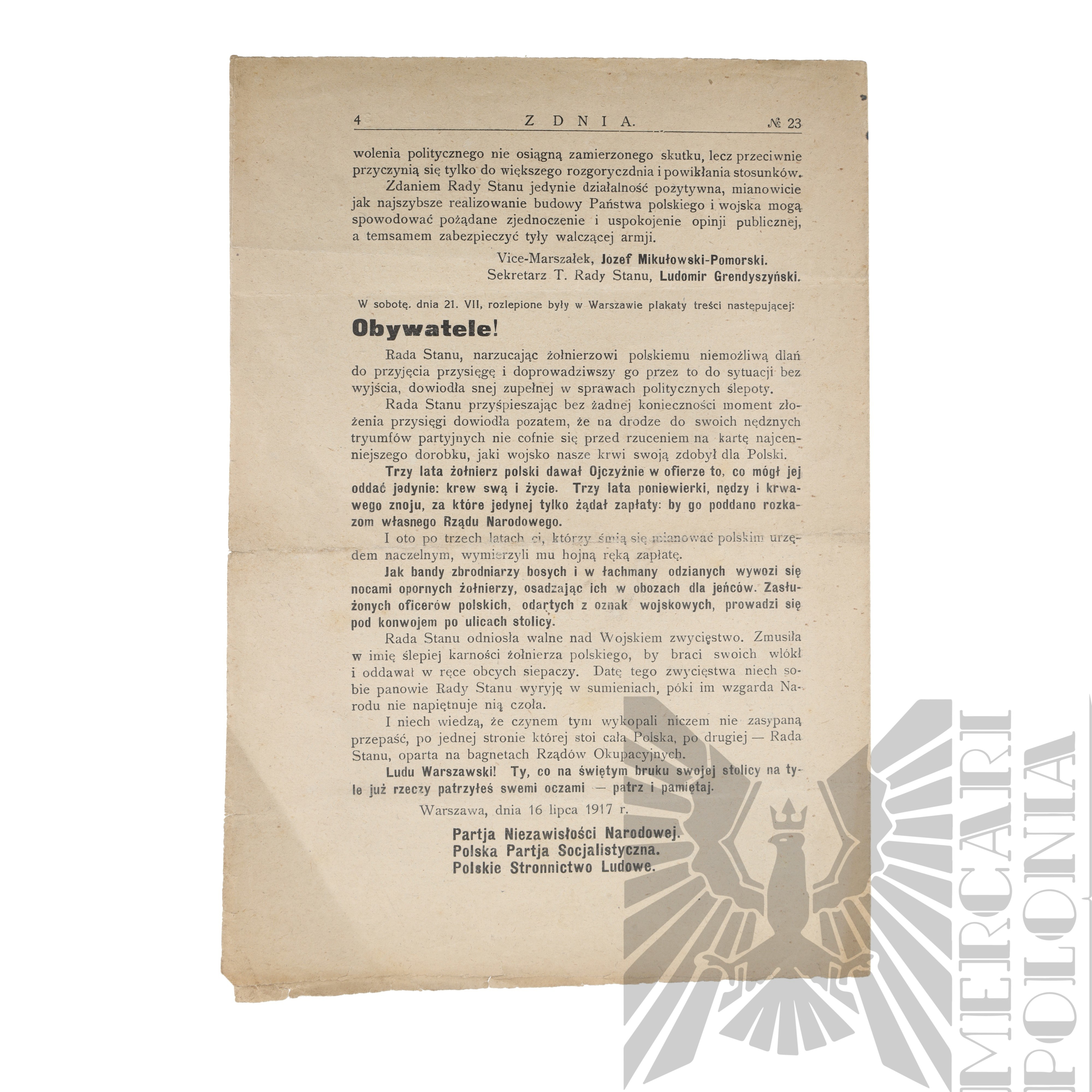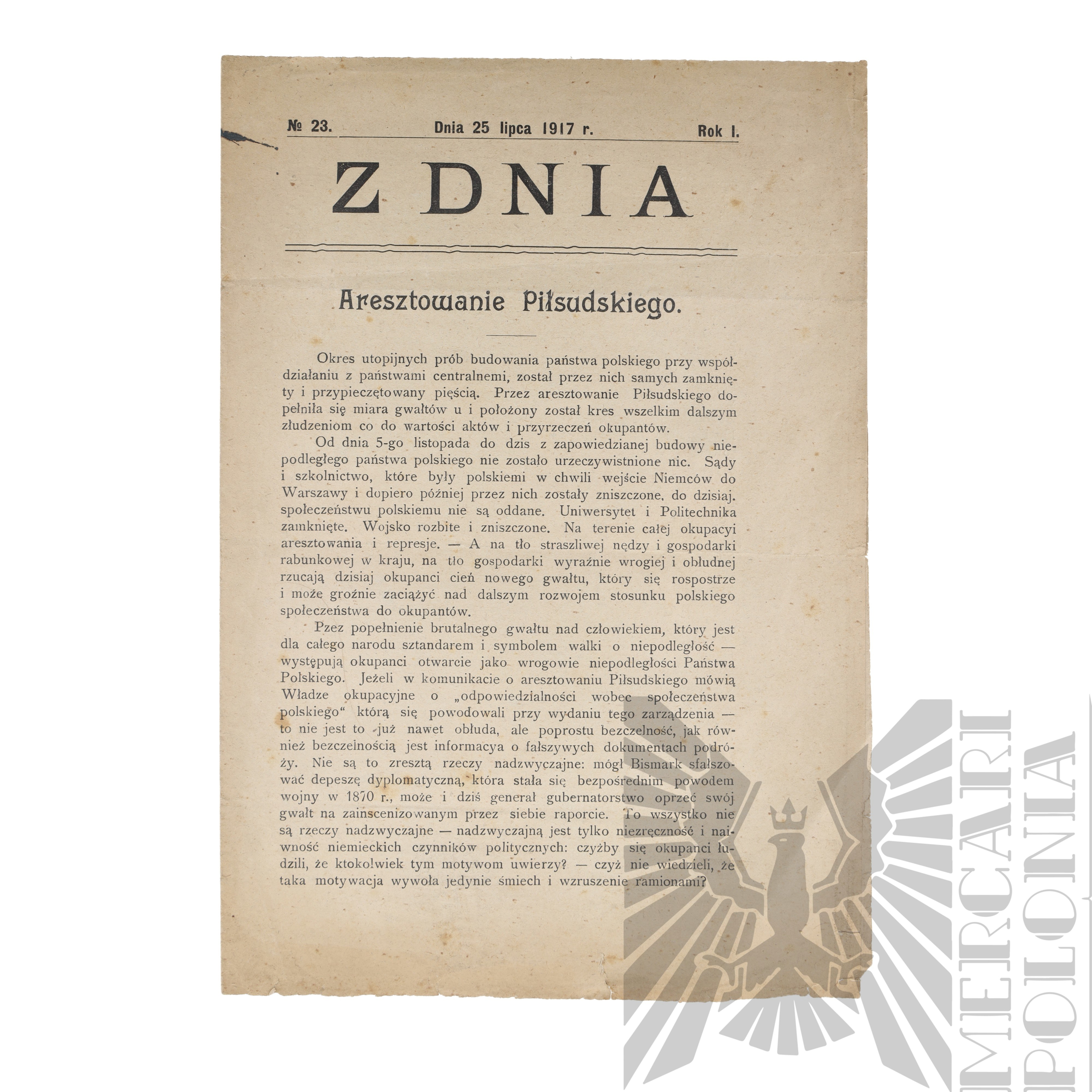 To wydanie z 25 lipca 1917 r. gazety „Z Dnia” informuje o aresztowaniu Józefa Piłsudskiego. Tekst podkreśla, że zatrzymanie Piłsudskiego symbolizuje koniec prób budowania państwa polskiego przy współpracy z państwami centralnymi. Autor opisuje, że od listopada 1916 r. Polacy nie uzyskali obiecanej niezależności, a okupanci ograniczali życie społeczne i gospodarcze, rabując kraj i wprowadzając represje. Uniwersytety, sądy czy wojsko nie zostały oddane w ręce Polaków, a zamiast tego następowało niszczenie i zamykanie instytucji.