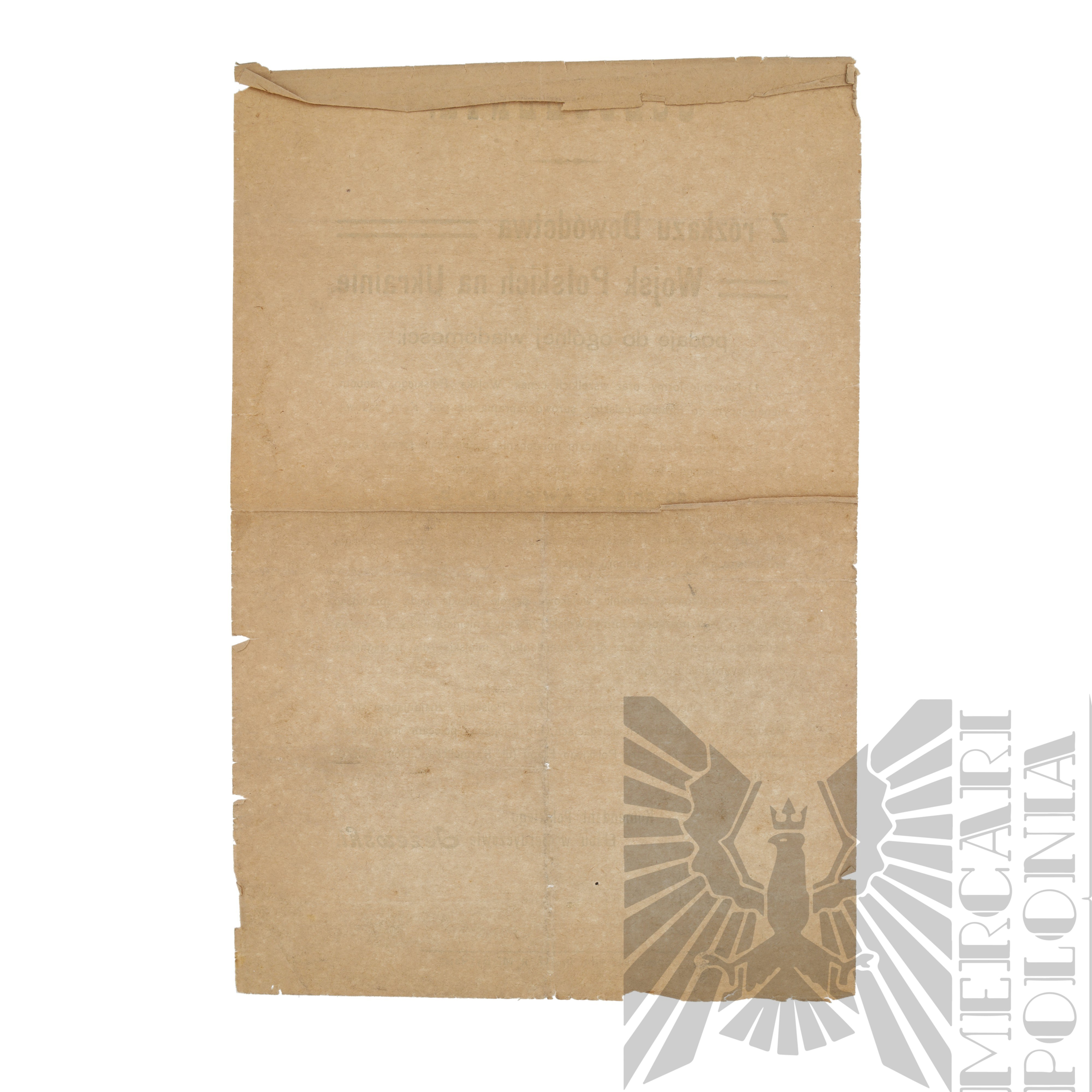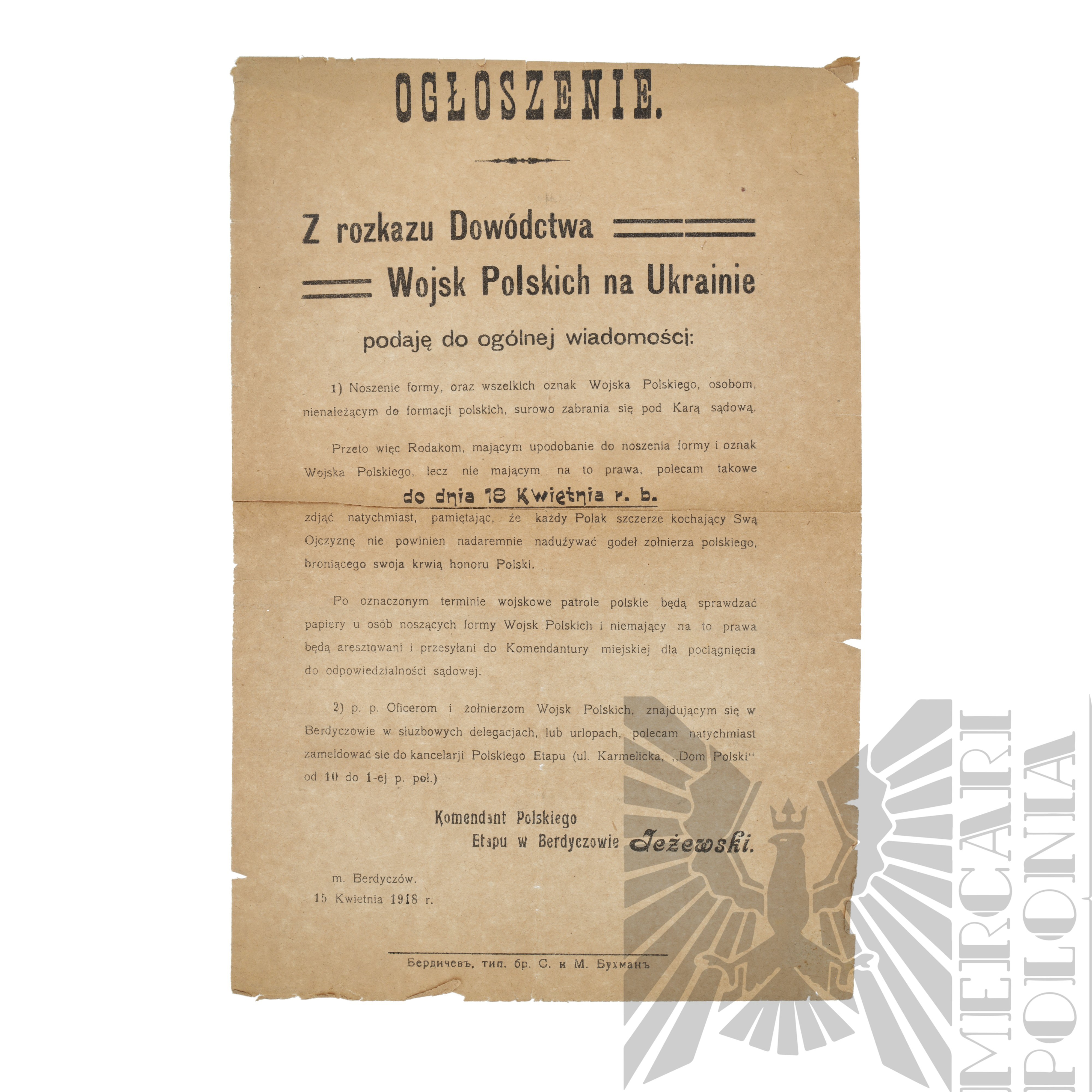 Ogłoszenie z 15 kwietnia 1918 r. wydane przez Dowództwo Wojsk Polskich na Ukrainie w Berdyczowie. Zakazuje noszenia munduru i oznak Wojska Polskiego osobom cywilnym, nakazuje ich zdjęcie do wyznaczonej daty, zapowiada kontrole patroli wojskowych oraz aresztowania w przypadku naruszeń. Oficerowie i żołnierze przebywający w Berdyczowie mają obowiązek natychmiastowego zameldowania się w kancelarii Polskiego Etapu.
